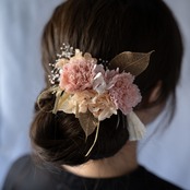 繊細な花々が特別な日を彩る、プリザーブドフラワーやドライフラワーを使用した髪飾り(ヘッドフラワー)と六角形のミラーのセットです。