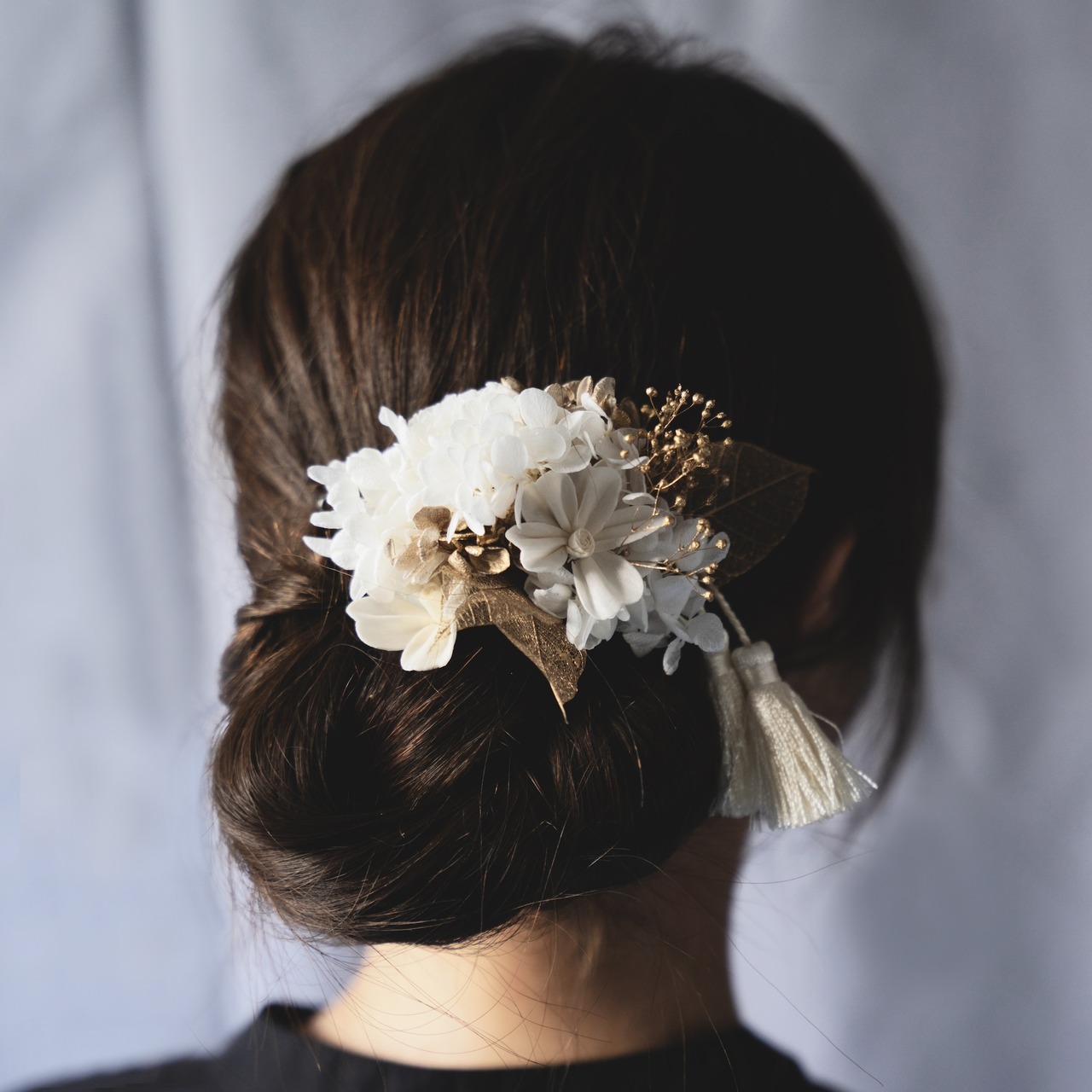 繊細な花々が特別な日を彩る、プリザーブドフラワーやドライフラワーを使用した髪飾り(ヘッドフラワー)と六角形のミラーのセットです。