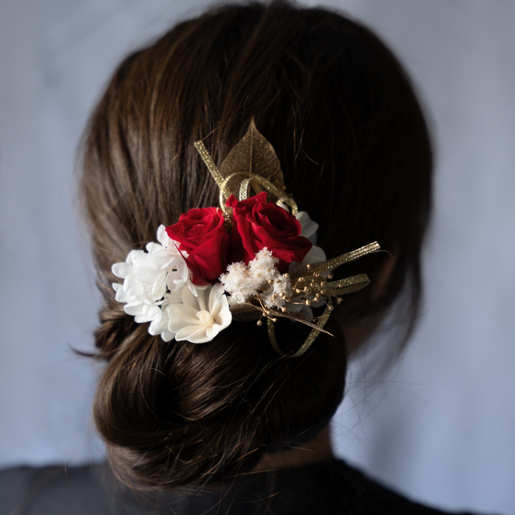 繊細な花々が特別な日を彩る、プリザーブドフラワーやドライフラワーを使用した髪飾り(ヘッドフラワー)と六角形のミラーのセットです。
