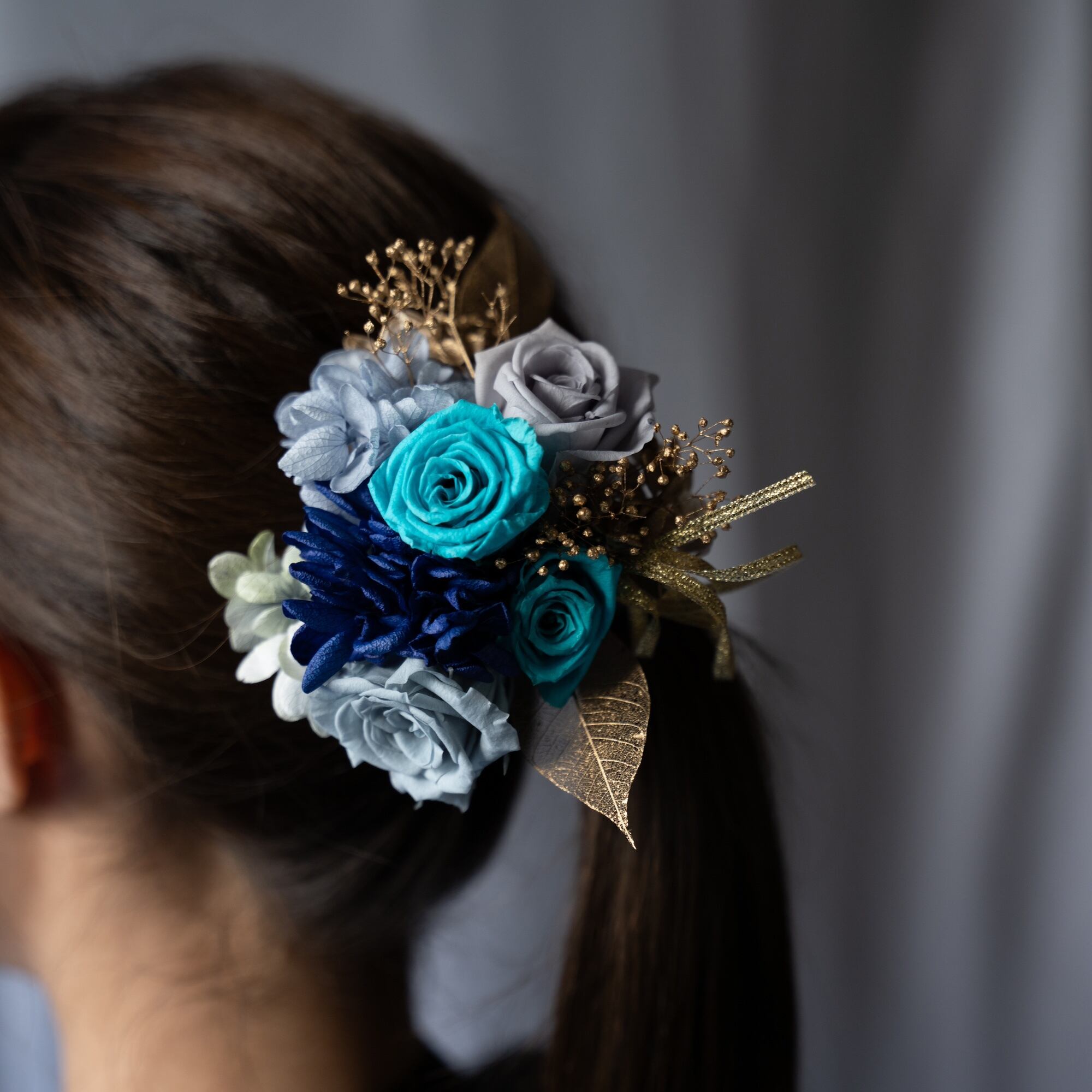 繊細な花々が特別な日を彩る、プリザーブドフラワーやドライフラワーを使用した髪飾り(ヘッドフラワー)と六角形のミラーのセットです。