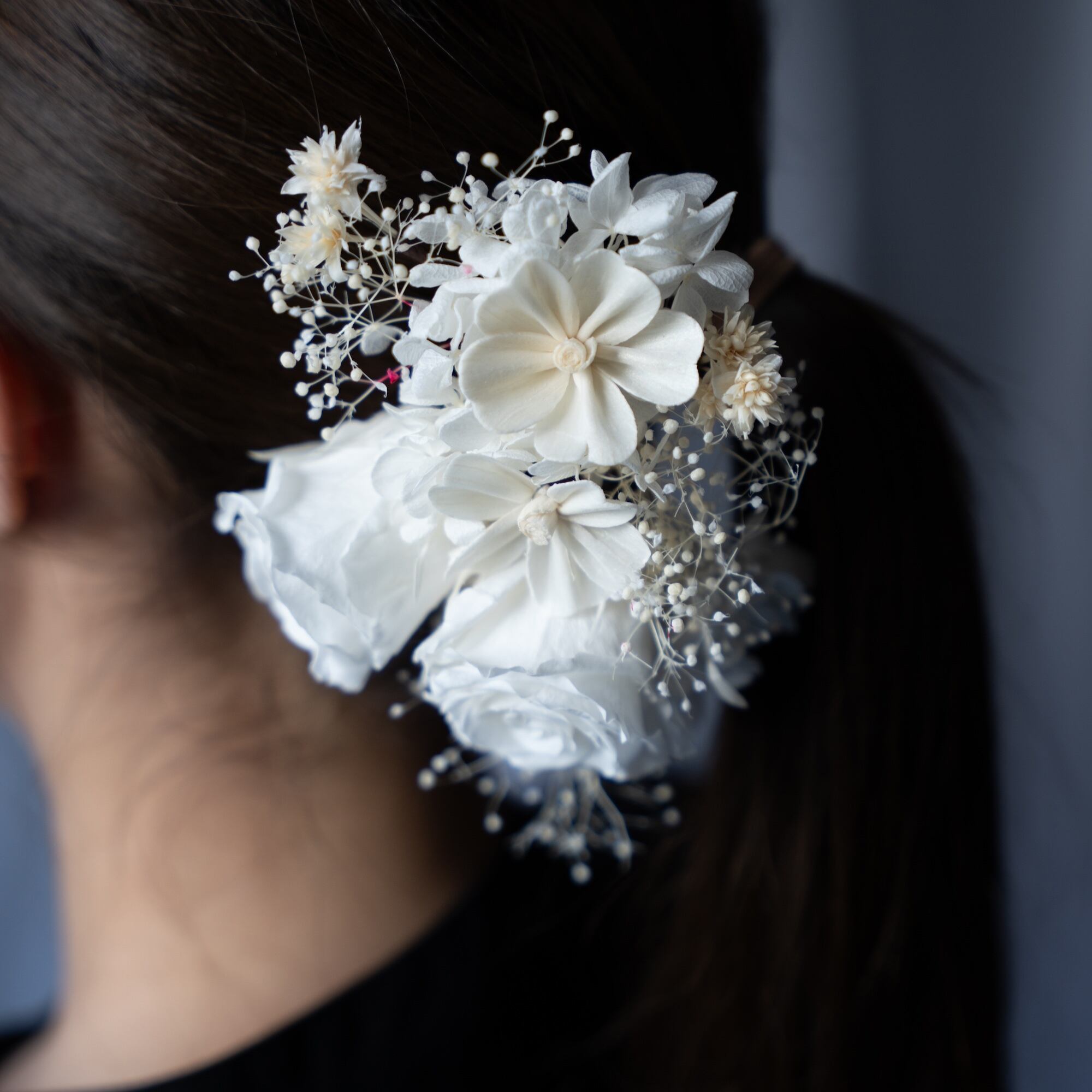 繊細な花々が特別な日を彩る、プリザーブドフラワーやドライフラワーを使用した髪飾り(ヘッドフラワー)と六角形のミラーのセットです。