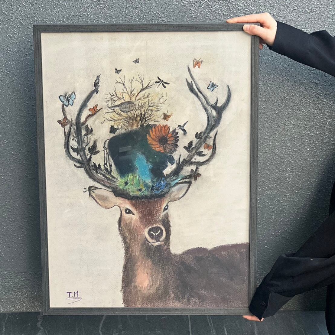 堂々とした鹿の頭部に、生命力溢れる植物と、舞い飛ぶ蝶や鳥たちが美しく調和した、他に類を見ない1点物のアート作品です。