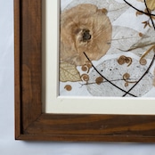 甘すぎないアンニュイな色合いが美しい、繊細な花々のデザインの押し花アート。