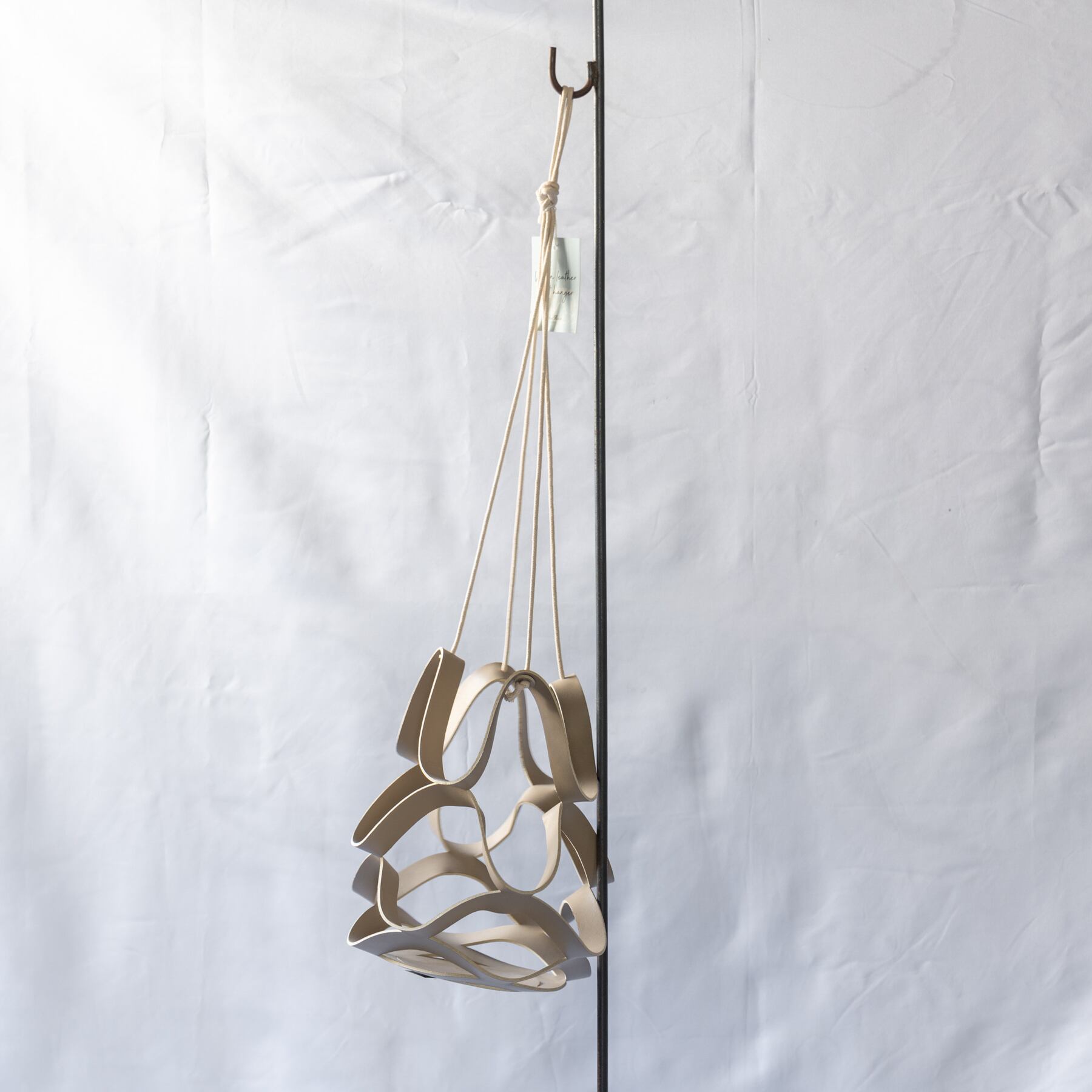 円形のベースに切り込みを入れ、吊るすと立体的になるユニークなデザインはサステナブルを意識したヴィーガンレザーを使用しています。