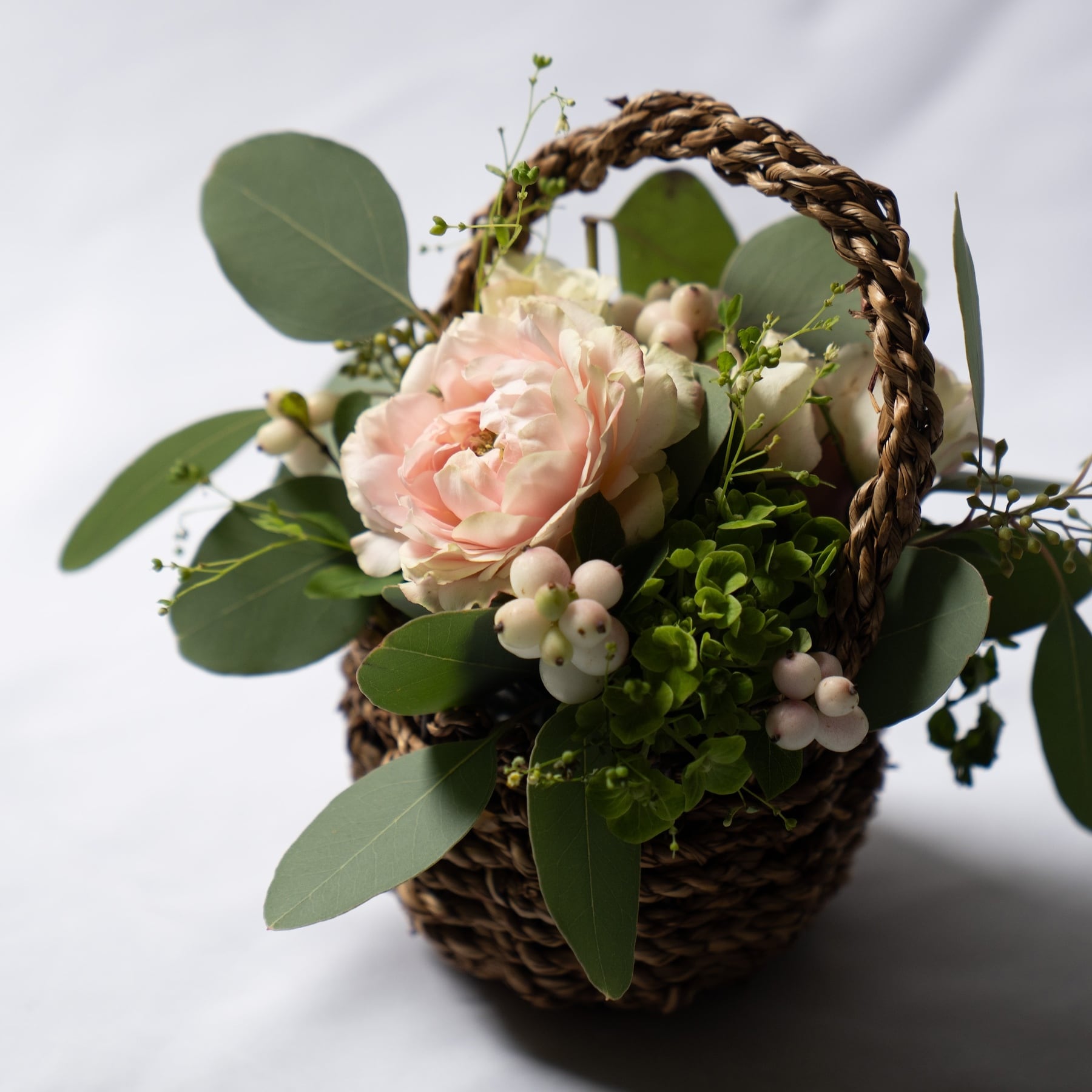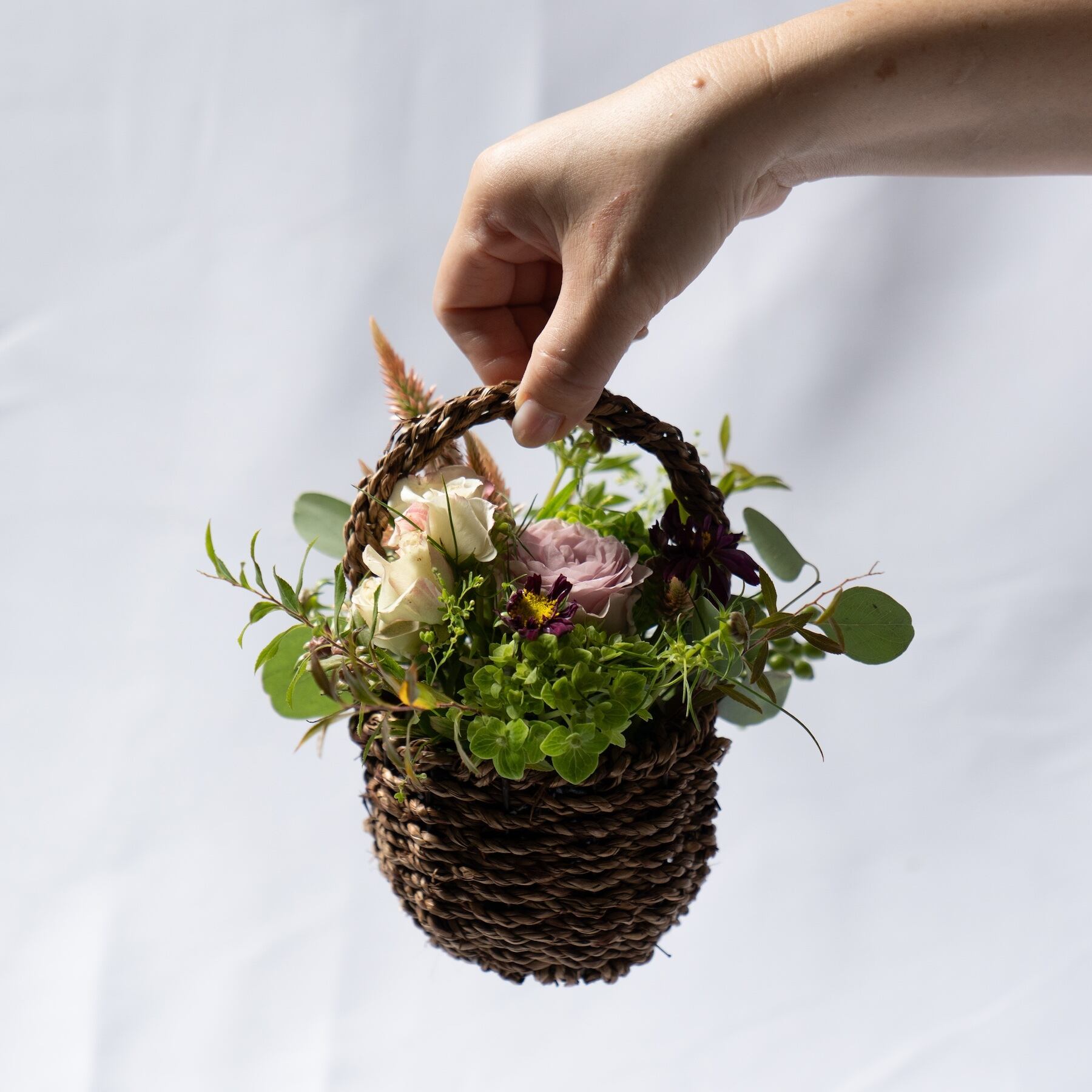 手のひらサイズの小さなバスケットに、季節の草花をぎゅっと詰め込んだ、可愛らしいフラワーアレンジメントです。