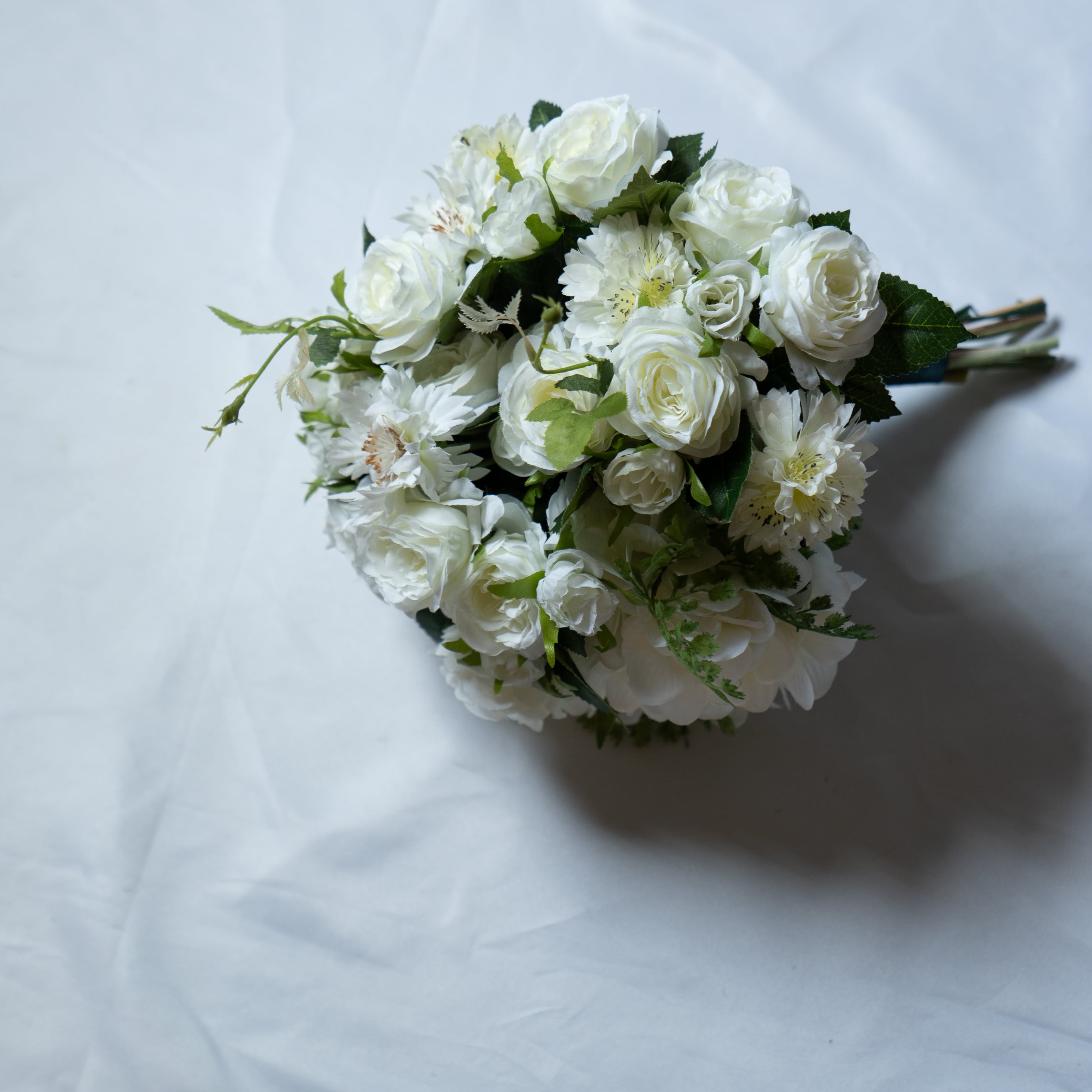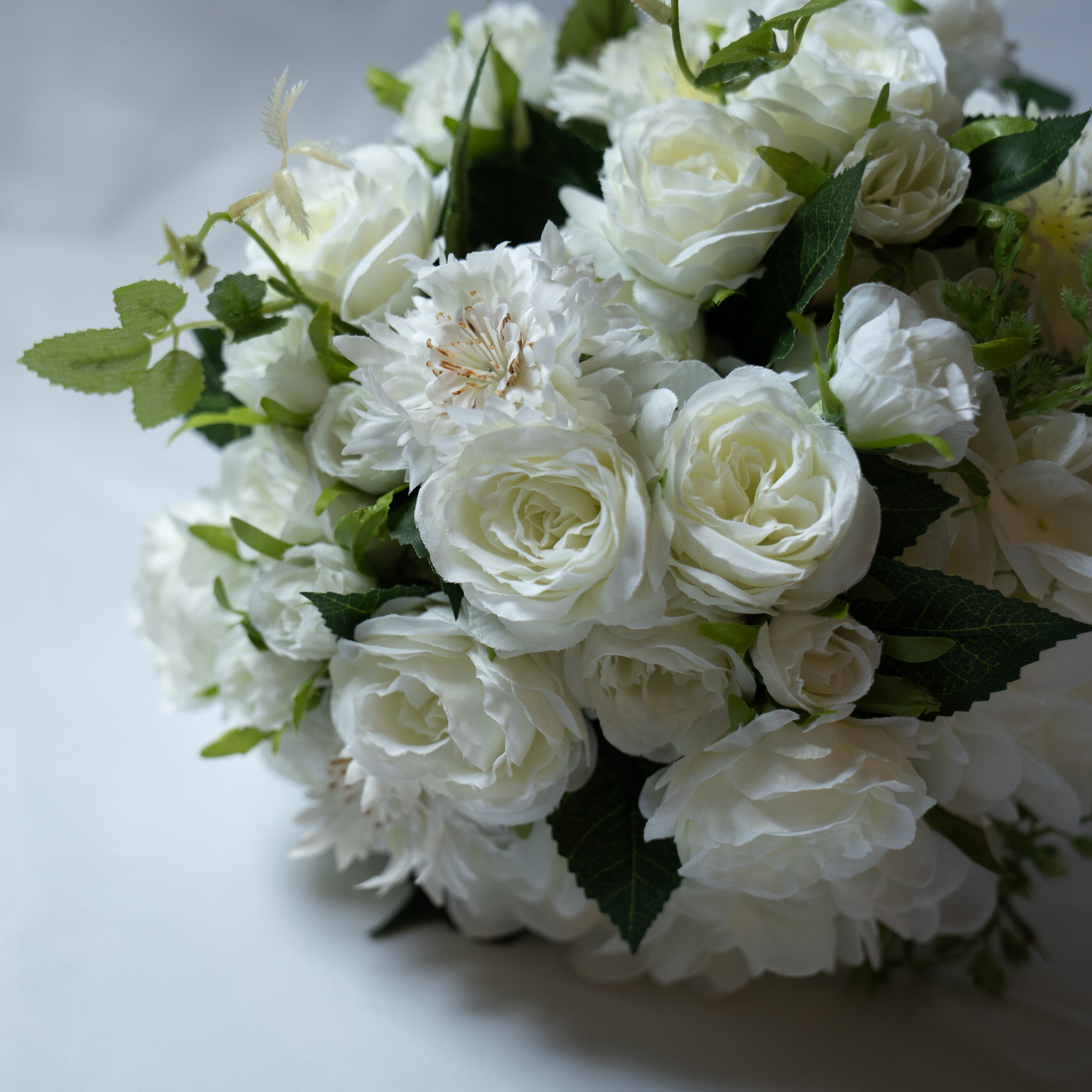 バラをメインに、表情豊かな様々な白い花を組み合わせたボリュームたっぷりのラウンドブーケです。