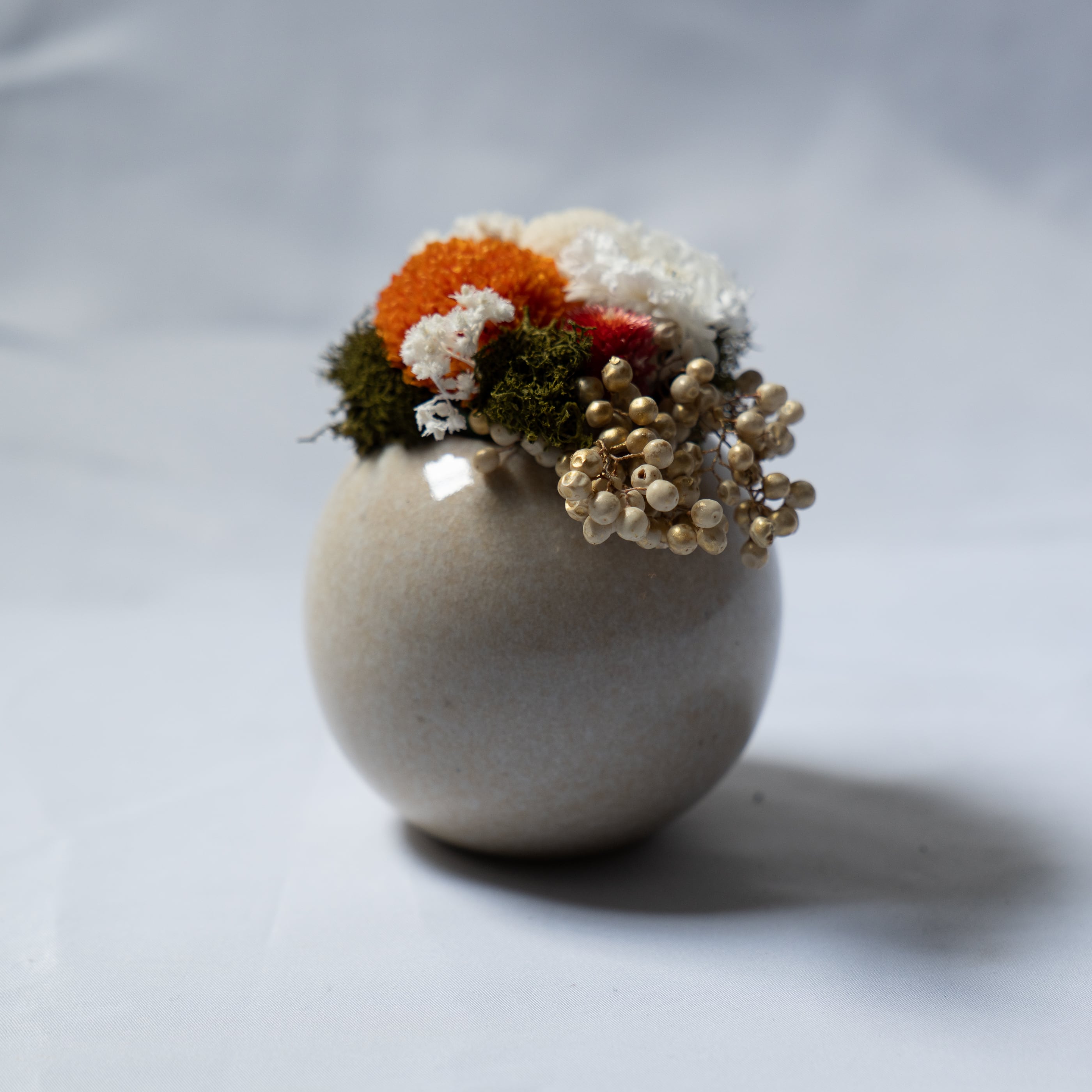 コロンとしたフォルムが愛らしい、花器とセットになったアレンジメントです。