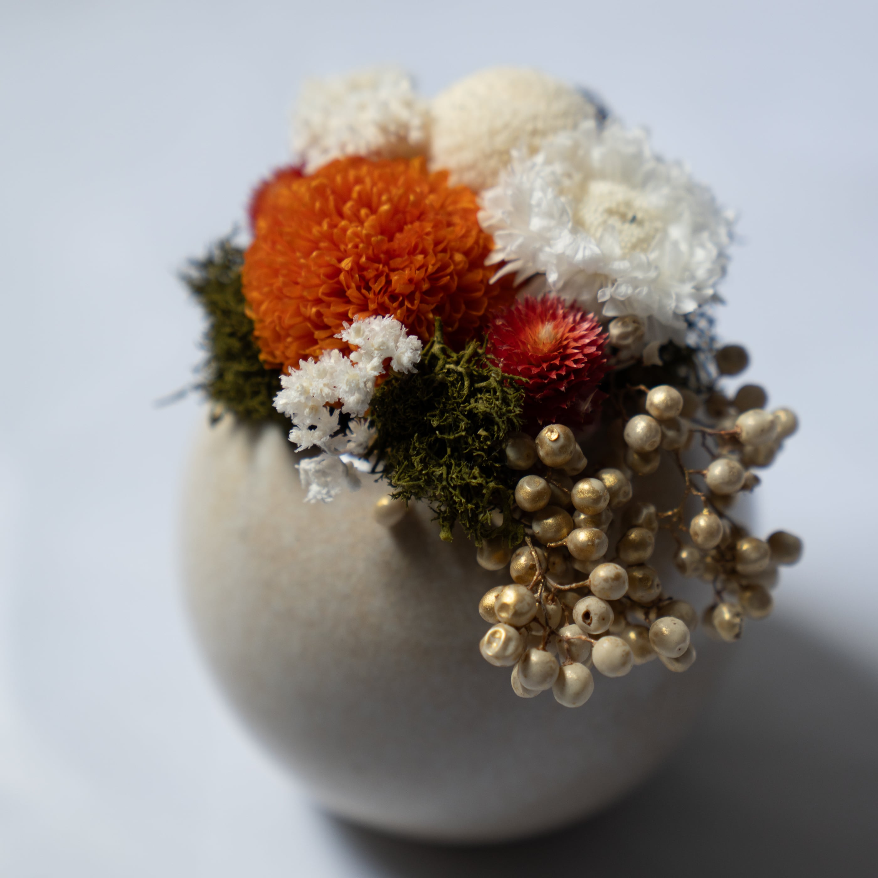 オレンジとホワイトの鮮やかな色合いのプリザーブドフラワーを中心に、深みのあるグリーンや上品なゴールドの実を添えて、温もりと華やかさをプラスしました。