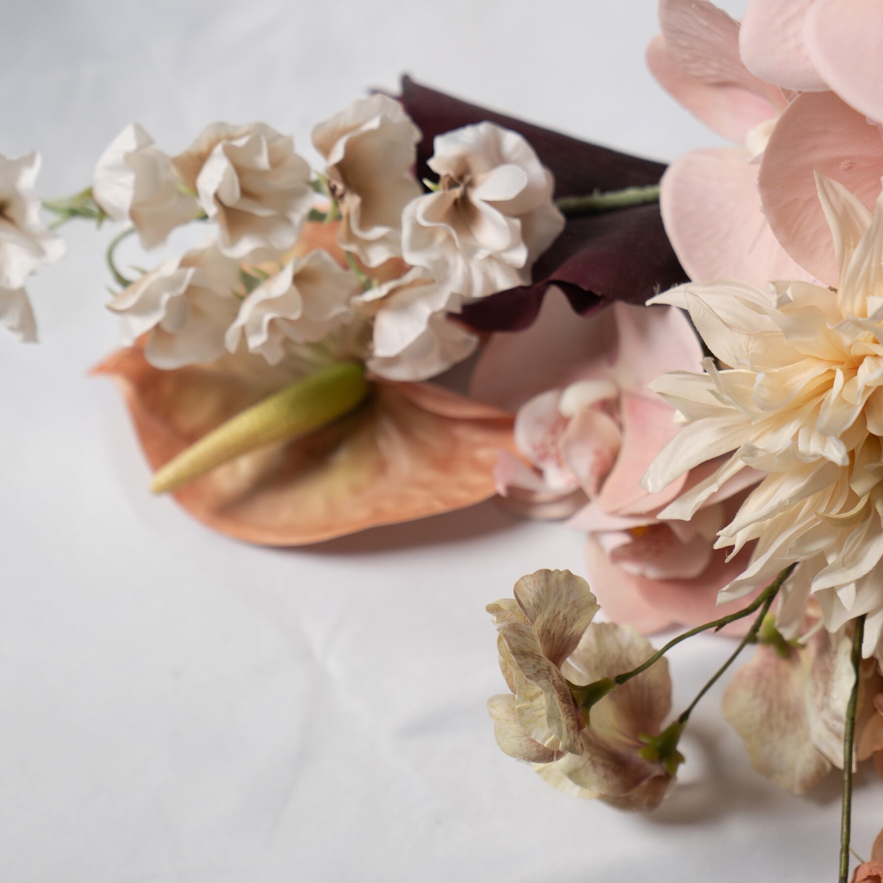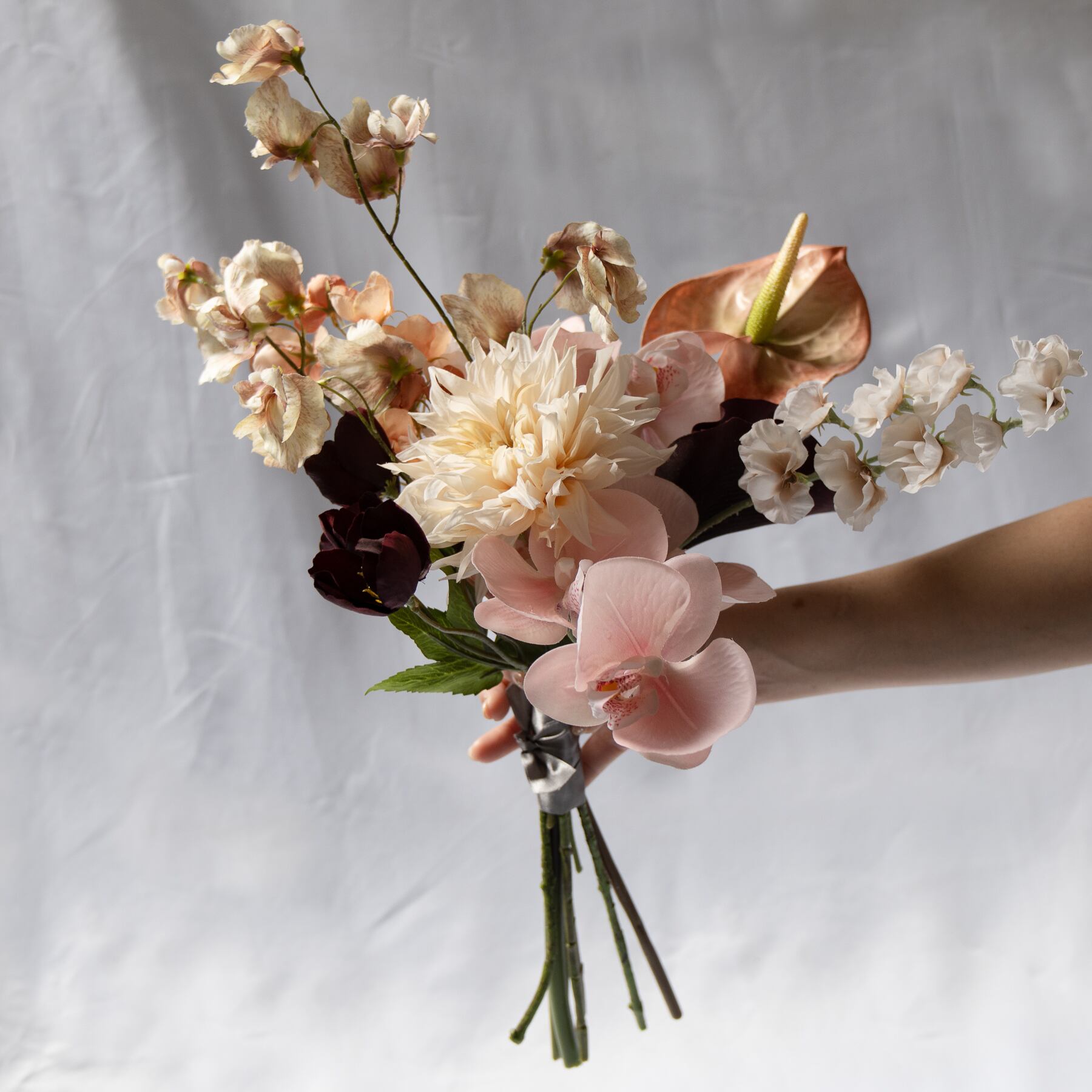 洗練されたピンクブラウンのニュアンスカラーでまとめた、アーティフィシャルフラワーブーケです。