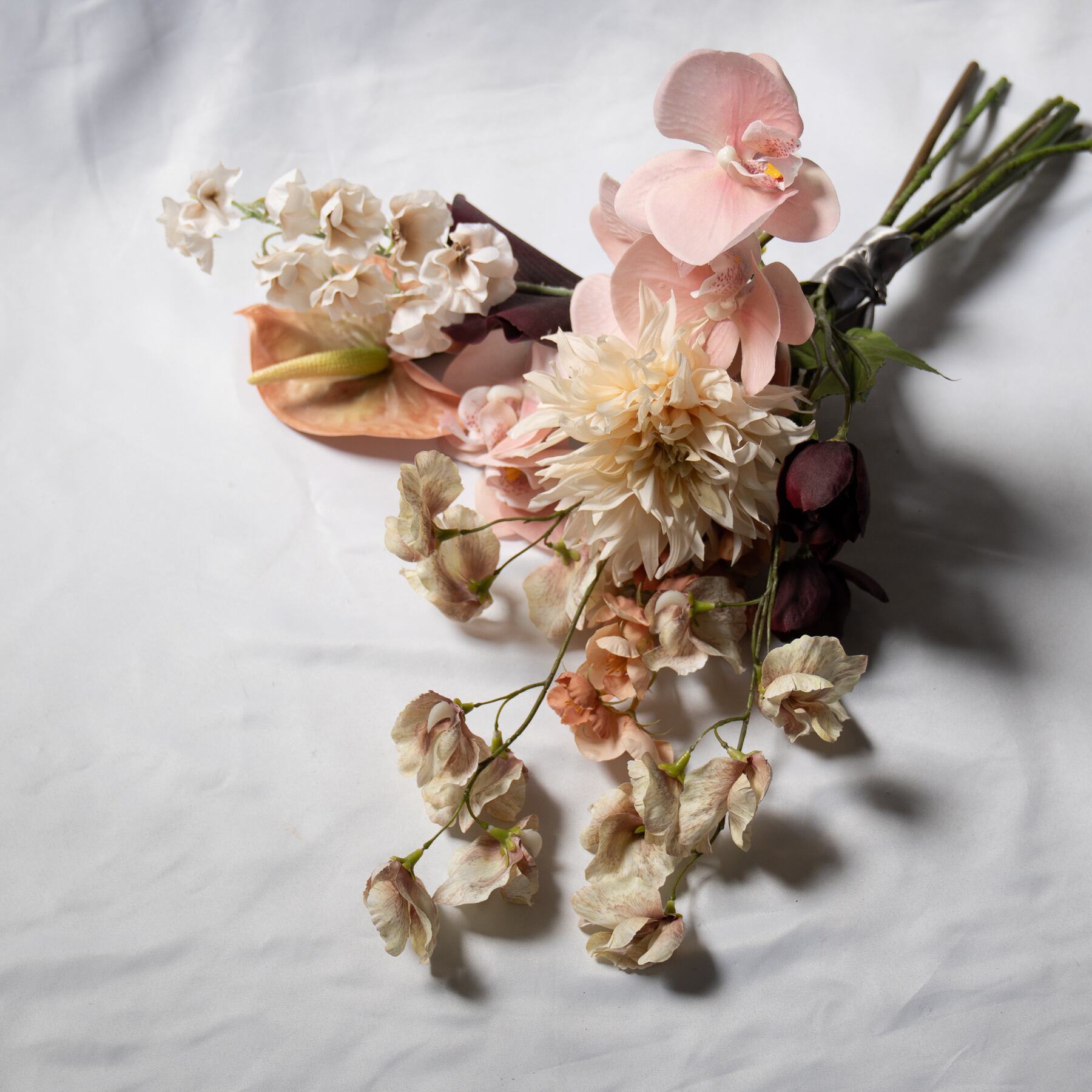 やさしい色合いのダリアや胡蝶蘭、フリルのように可憐なスイートピー、アクセントに深みのあるボルドーを組み合わせました。
