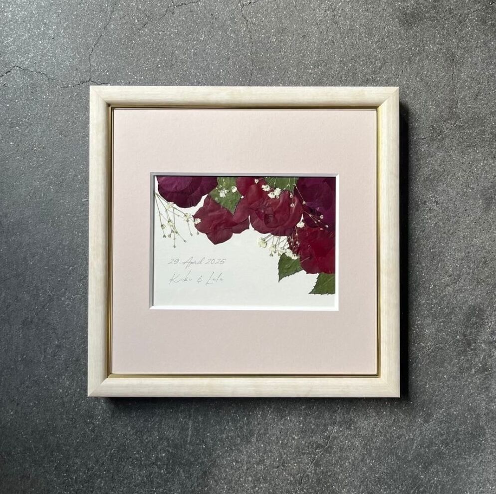 結婚式や、プロポーズ等で使用した後の生花の赤バラブーケをお預かりし、オリジナルプレスをして額装いたします。