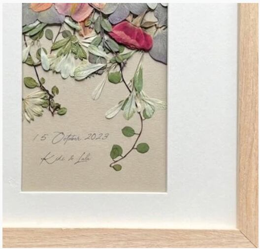 結婚式や、プロポーズ等で使用した後の生花の赤バラブーケをお預かりし、オリジナルプレスをして額装いたします。
