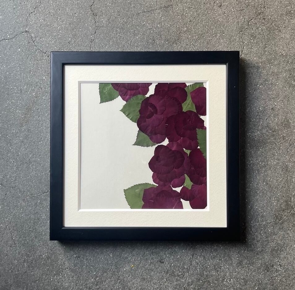 結婚式や、プロポーズ等で使用した後の生花の赤バラブーケをお預かりし、オリジナルプレスをして額装いたします。