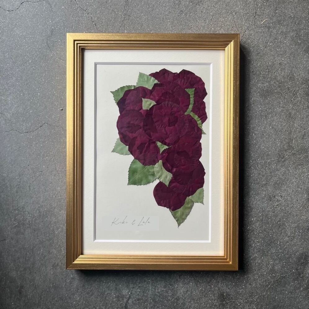 結婚式や、プロポーズ等で使用した後の生花の赤バラブーケをお預かりし、オリジナルプレスをして額装いたします。