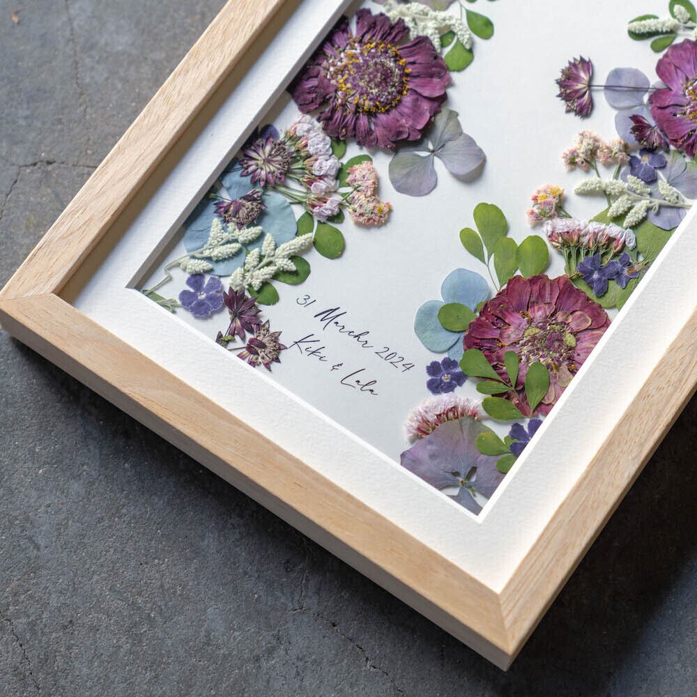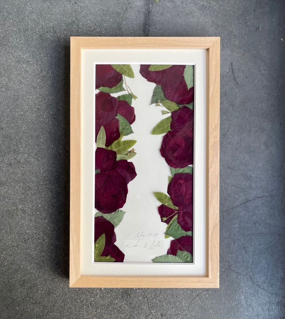 結婚式や、プロポーズ等で使用した後の生花の赤バラブーケをお預かりし、オリジナルプレスをして額装いたします。