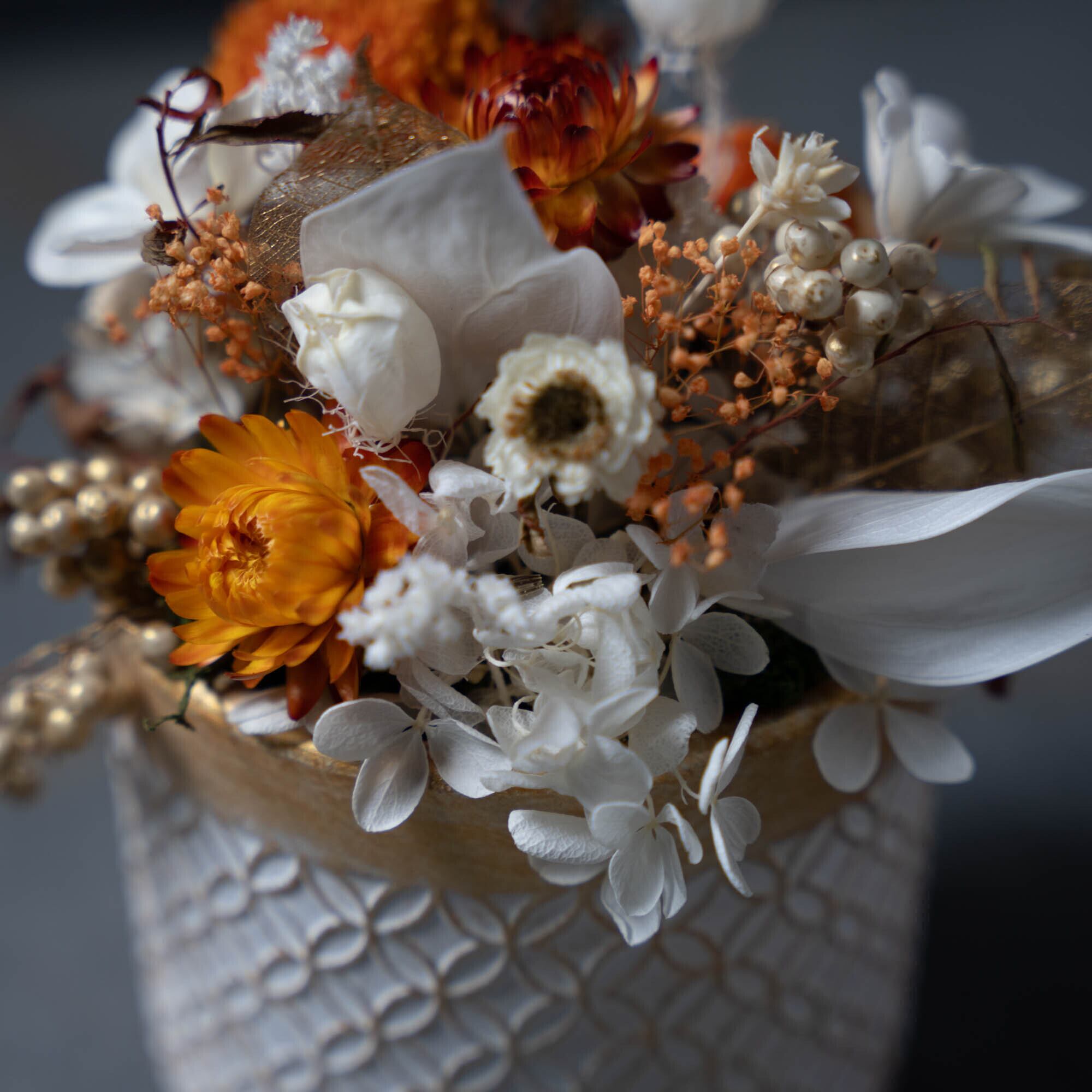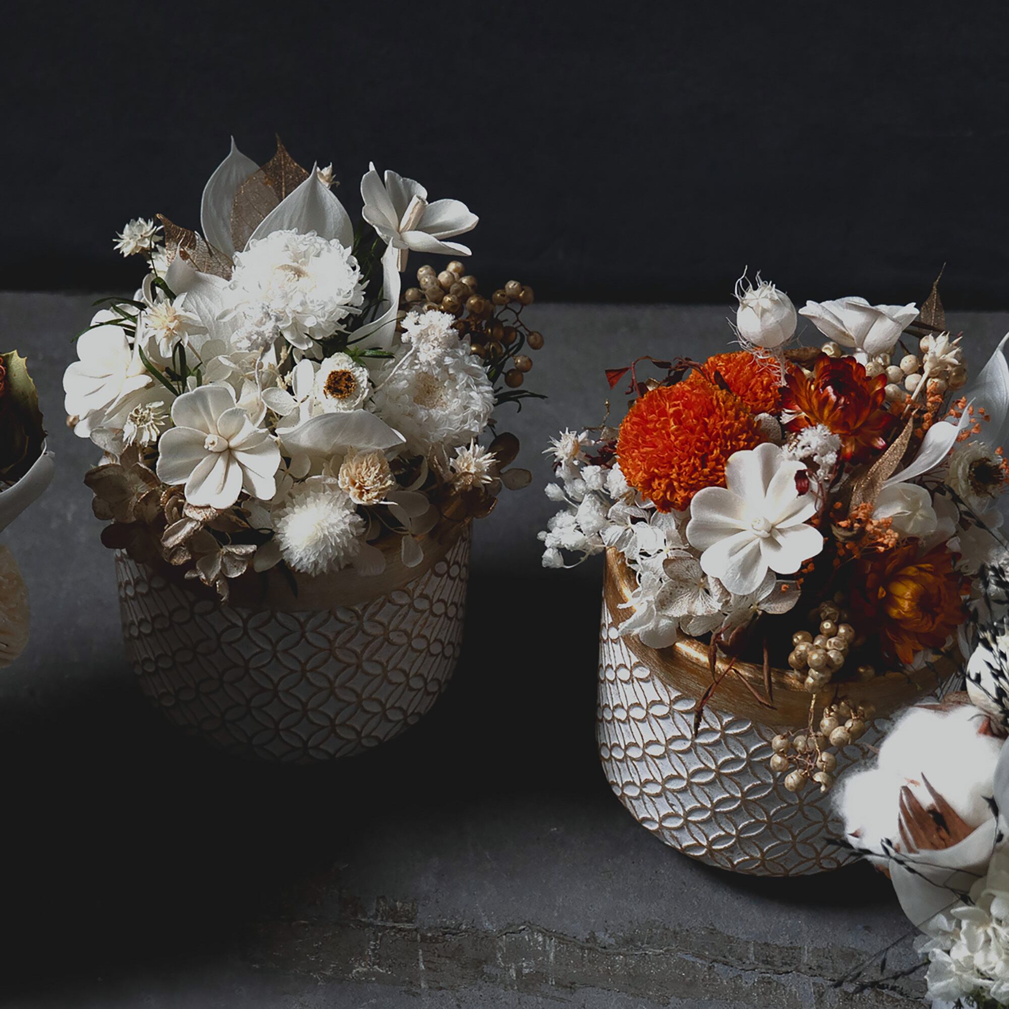 ・ドライフラワーやプリザーブドフラワーは湿気・直射日光にご注意ください。湿気と直射日光をさけていただければ、美しい状態を保ったまま長期間鑑賞していただけますが、経年変化も個性のひとつとしてお楽しみください。