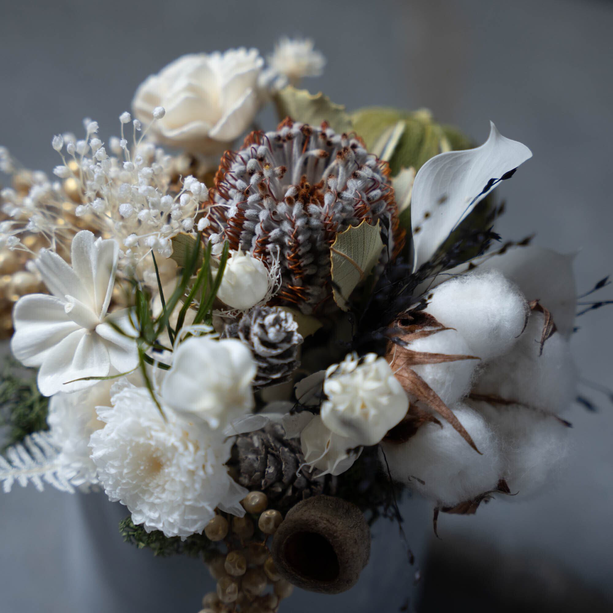 純白のコットンフラワーを中心に、様々な質感のドライフラワーを組み合わせた心温まるアレンジメントです。