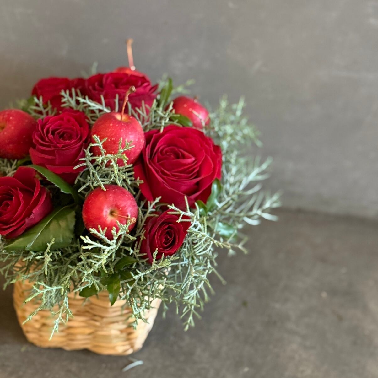 ナチュラルなバスケットから溢れ出すようなデザインは、まるで冬の森を切り取ったかのよう。りんごとバラの豊かな色彩が、飾るだけで一気にクリスマスムードへ導きます。
