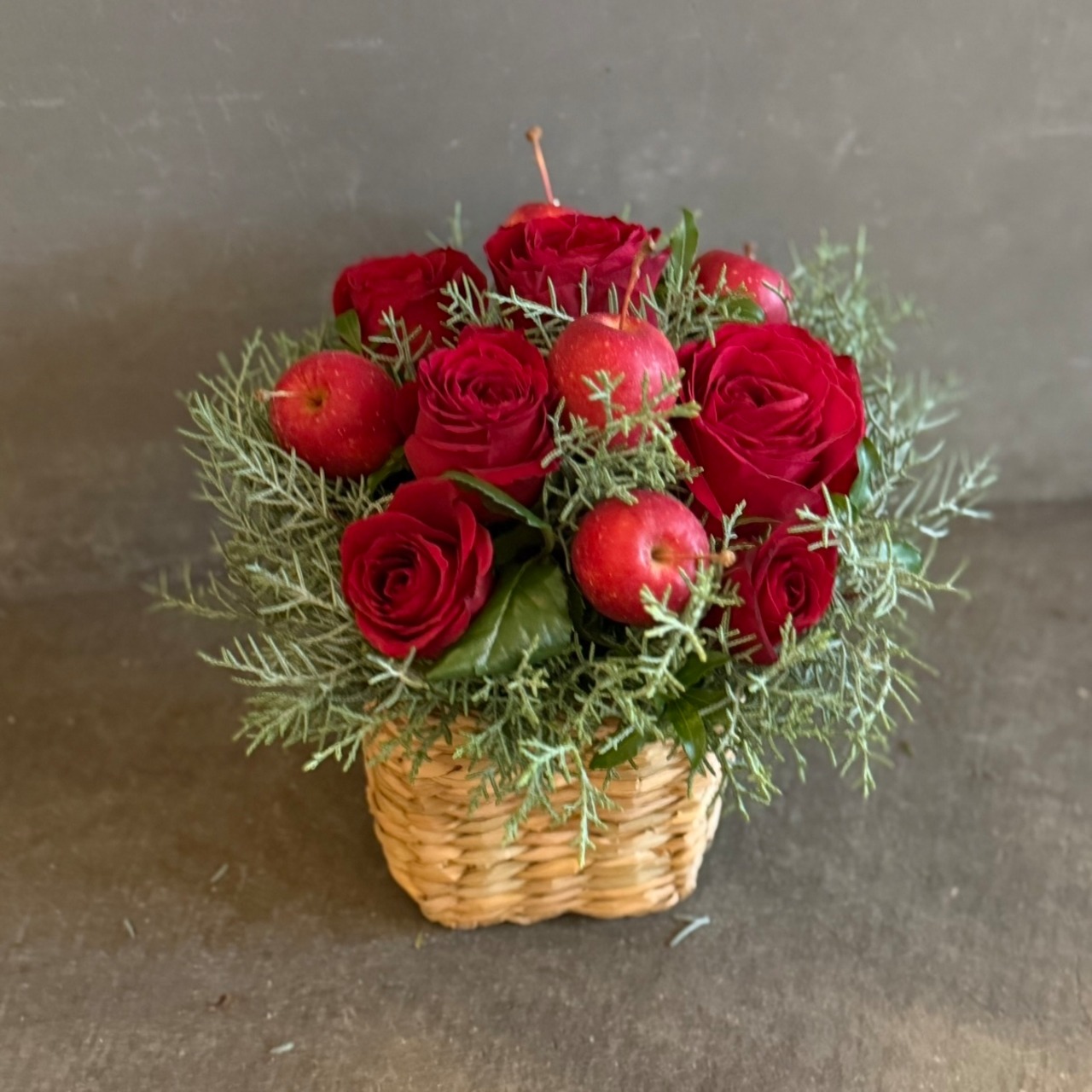 ナチュラルなバスケットから溢れ出すようなデザインは、まるで冬の森を切り取ったかのよう。りんごとバラの豊かな色彩が、飾るだけで一気にバレンタインムードへ導きます。
