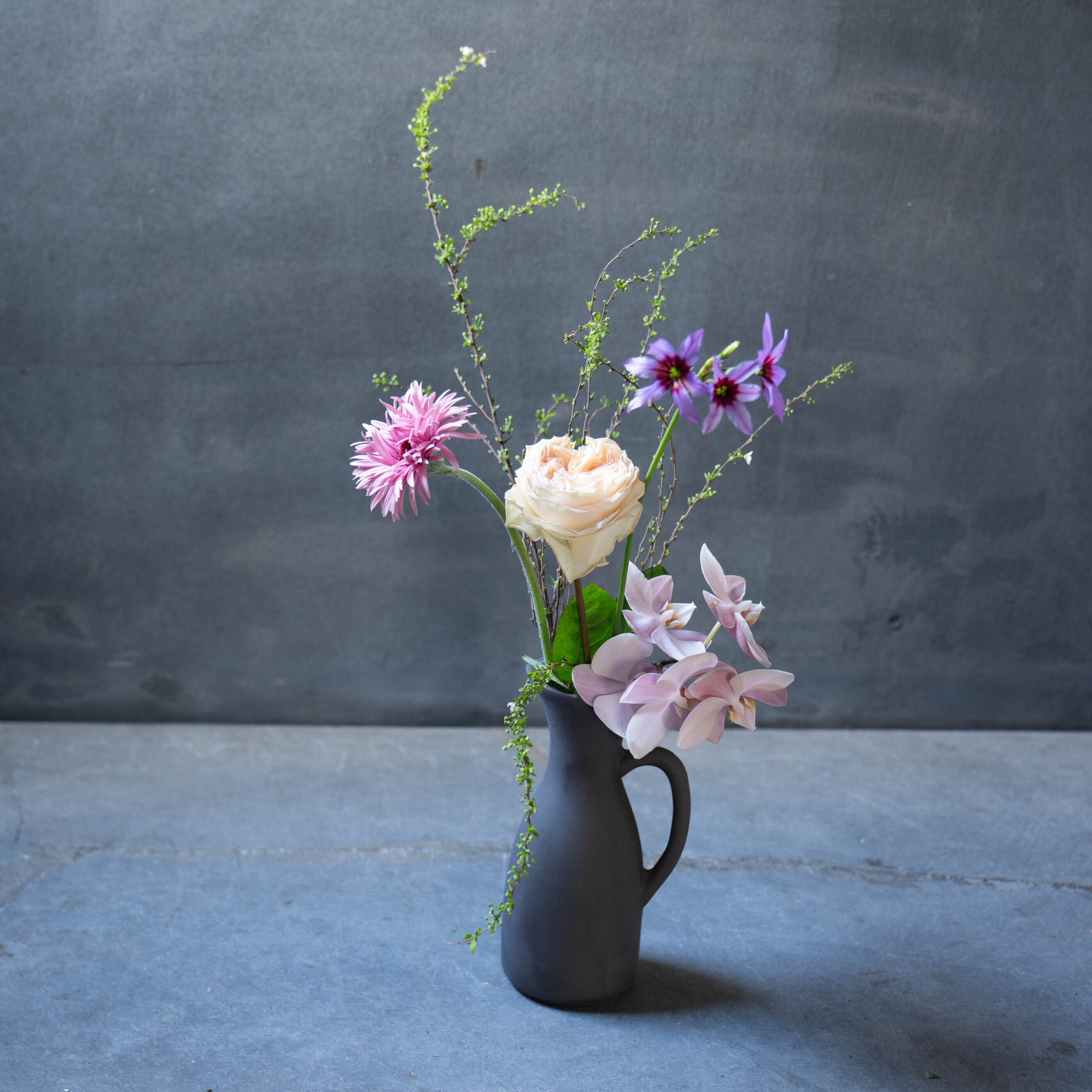 マットな質感とモダンなフォルムのベースが、飾る花々の美しさをより一層引き立てます。