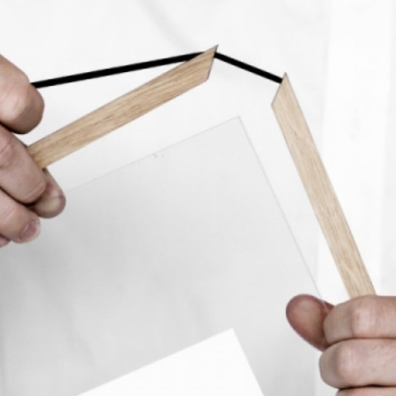 透明なアクリル2枚とウッドフレーム、それらを固定するラバーバンドのみで構成され、細いフレームと透明なデザインによって生み出される余白が、飾るものを引き立てます。