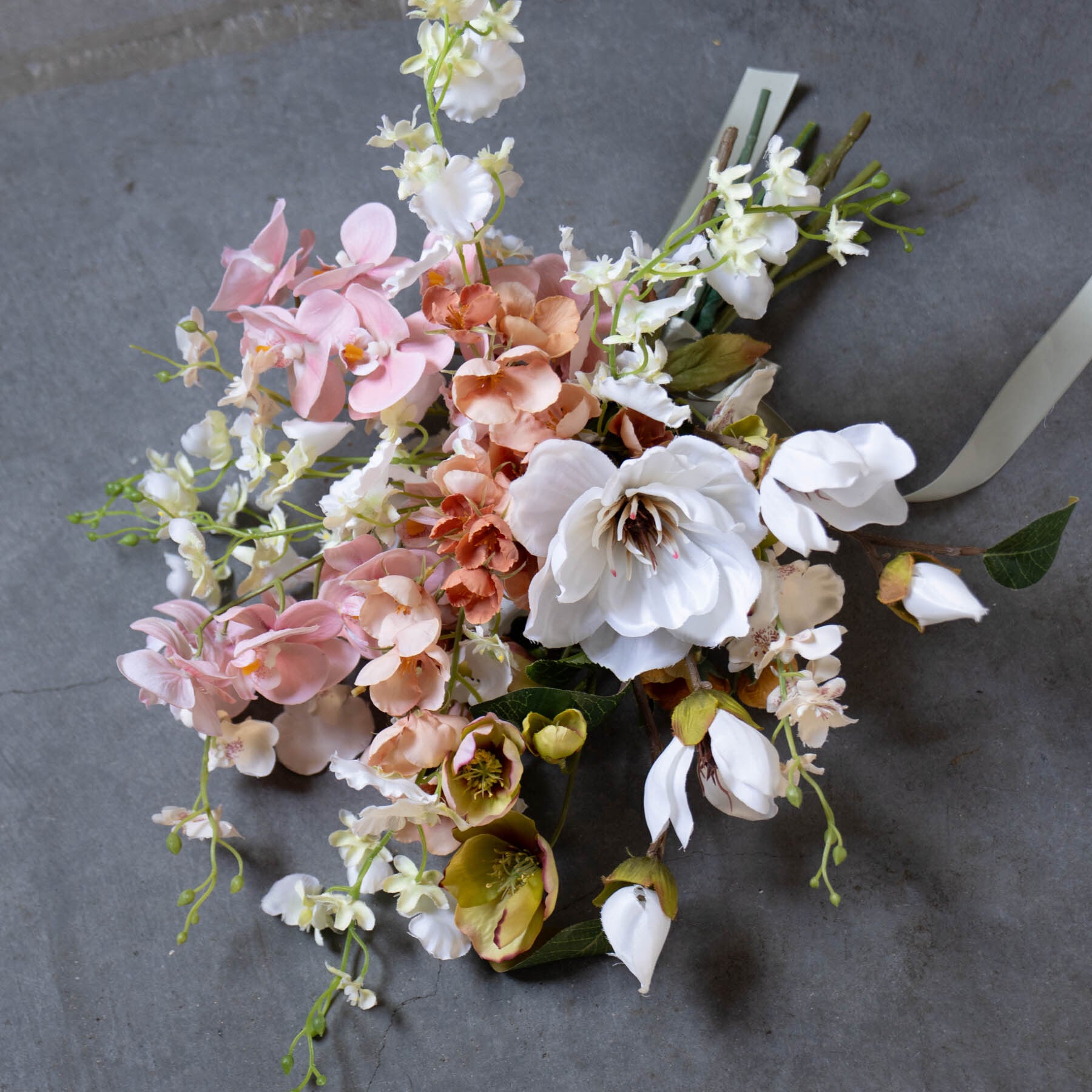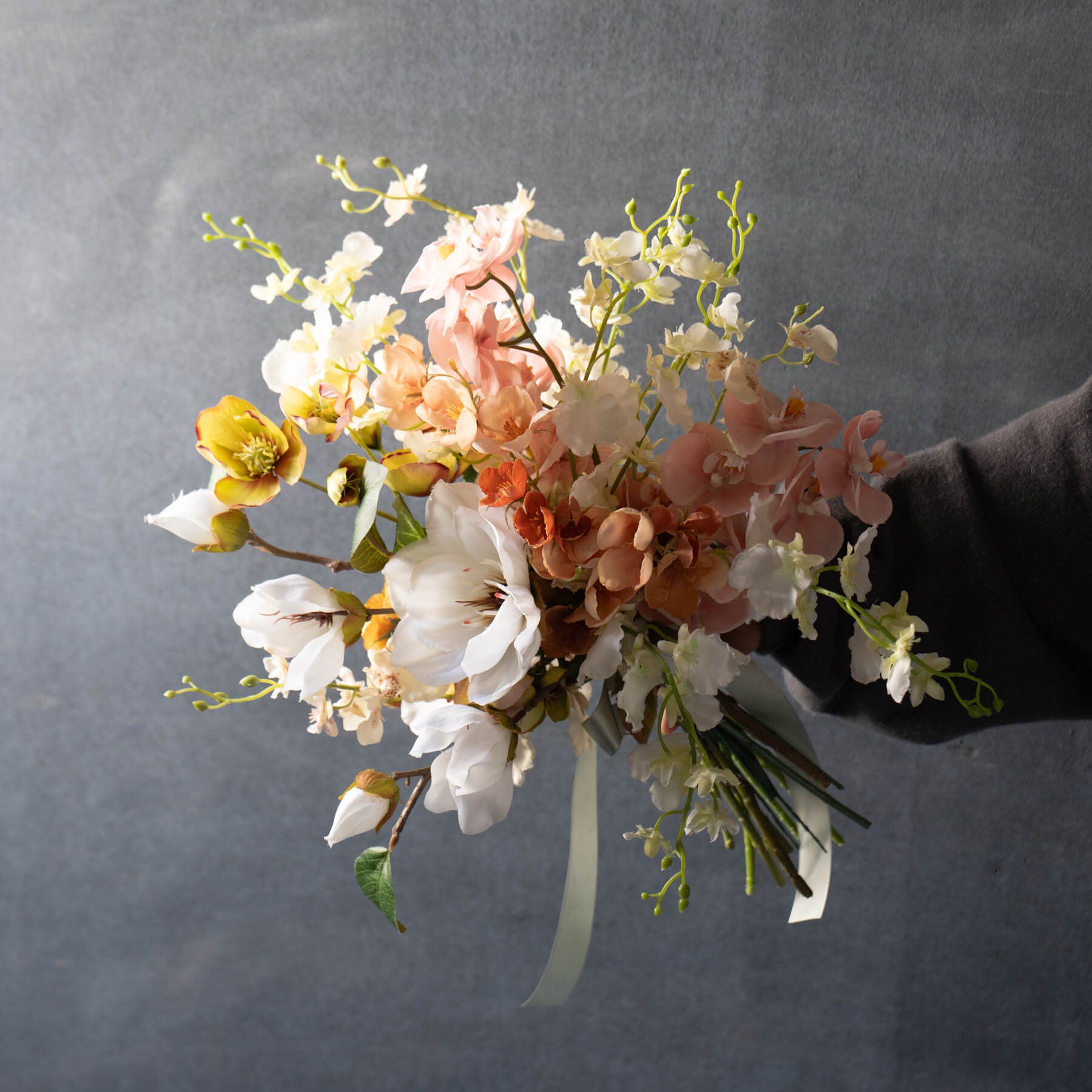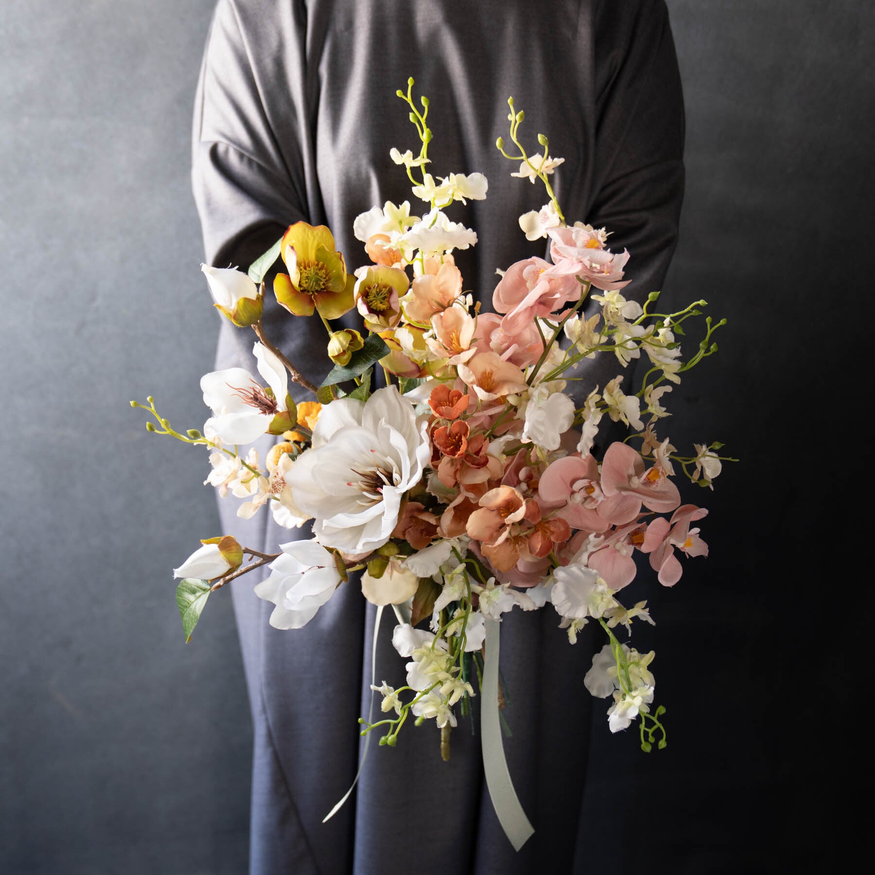 甘さを抑えたピンクブラウンのグラデーションカラーでまとめることで、華やかさの中に落ち着いた大人の品格を漂わせるアーティフィシャルフラワーブーケ。