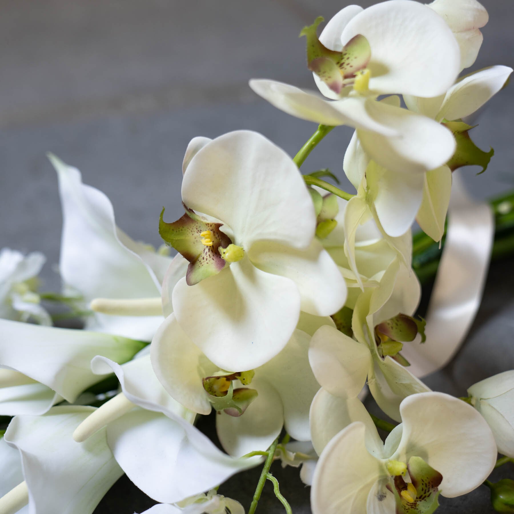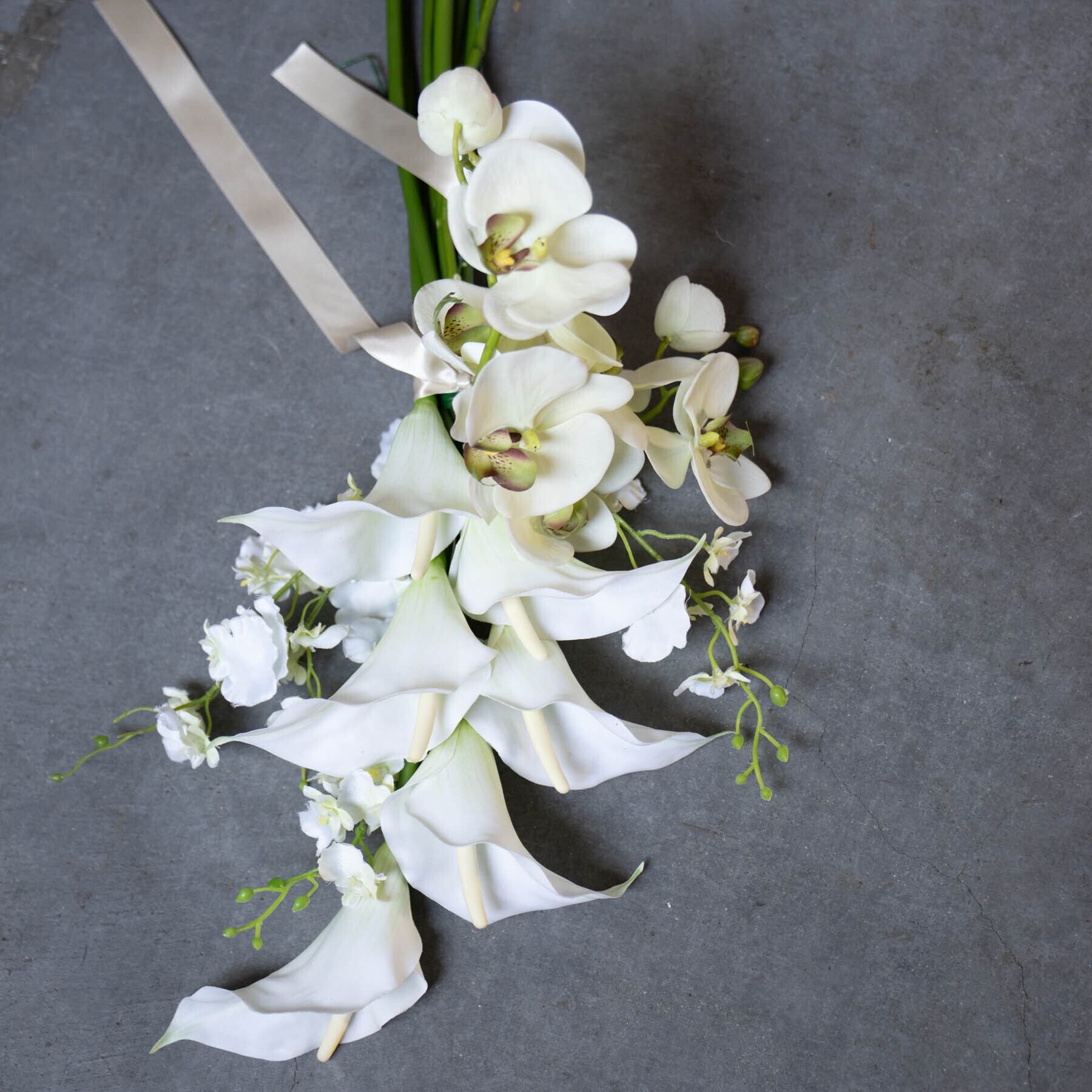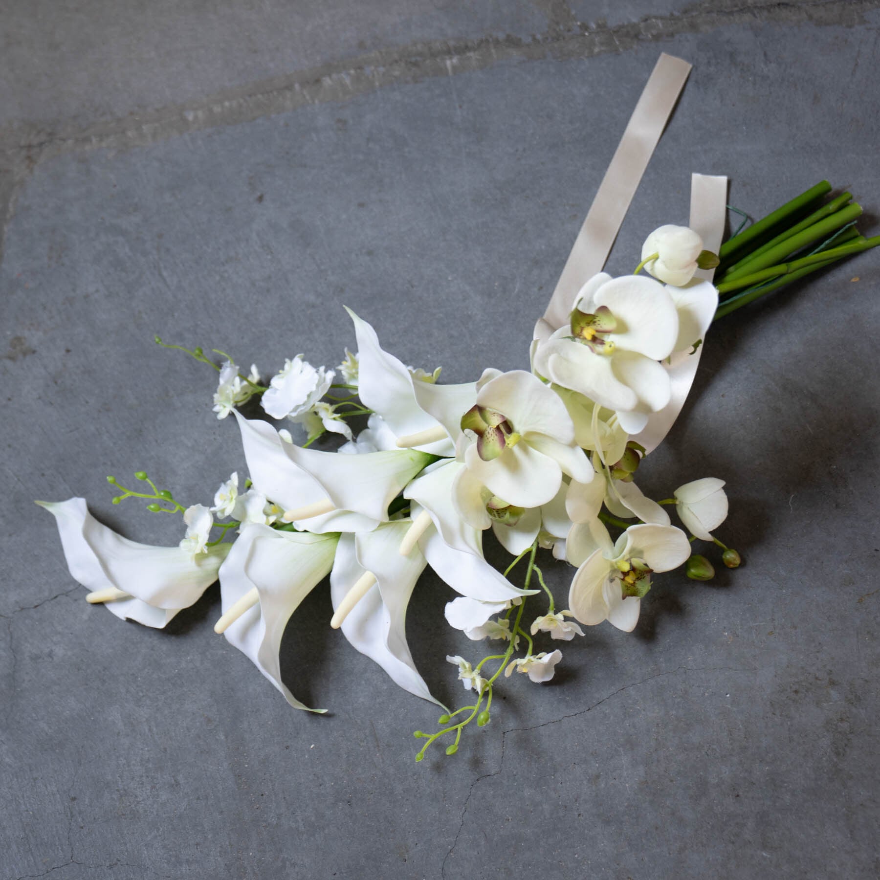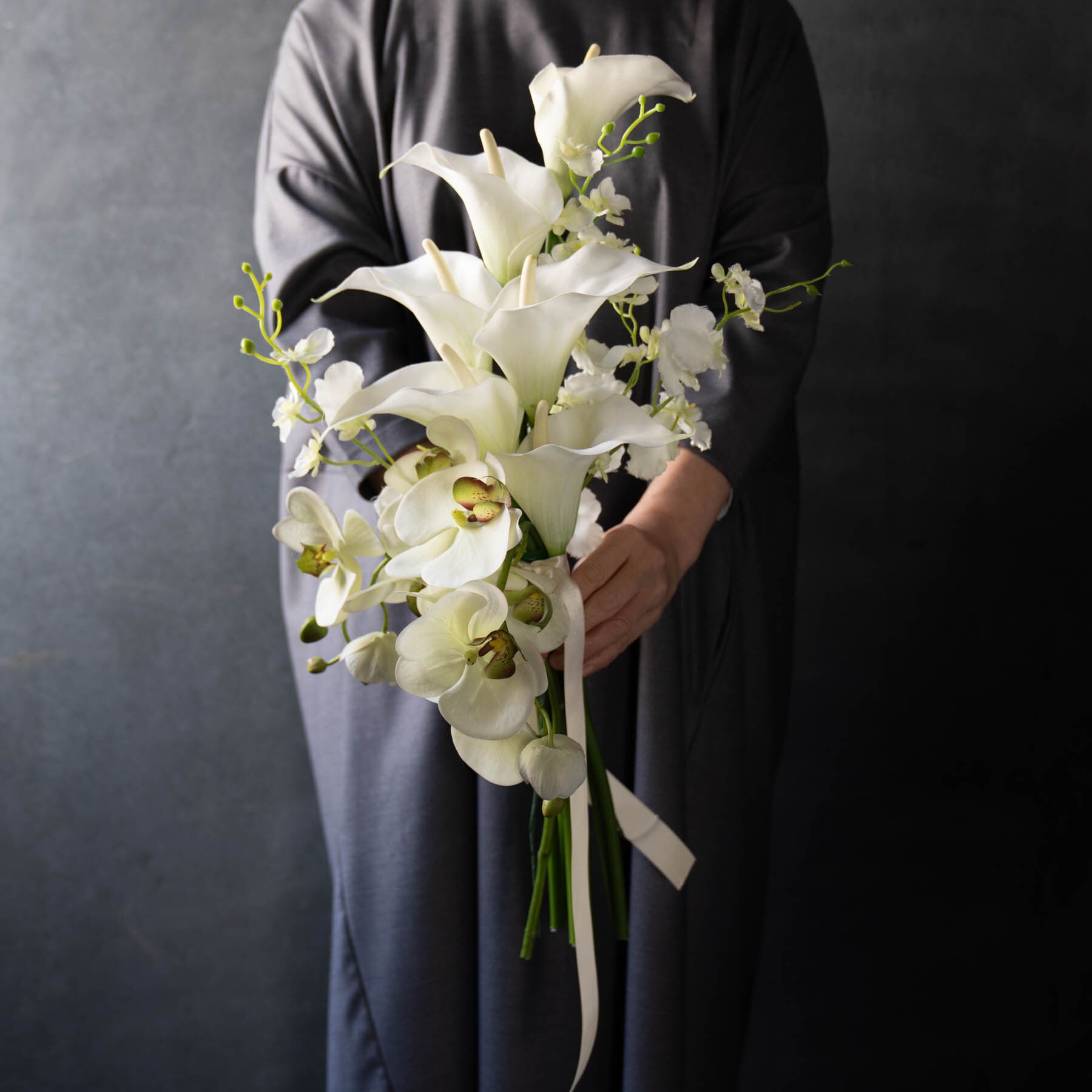 洗練された美しさを持つ胡蝶蘭を中心に添え、ホワイトのカラーを組み合わせたアーティフィシャルフラワーブーケです。