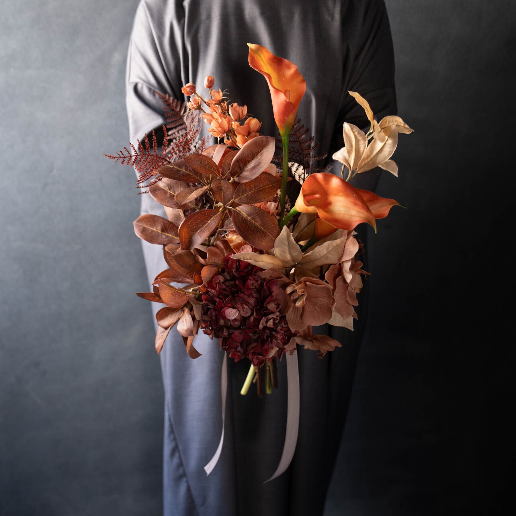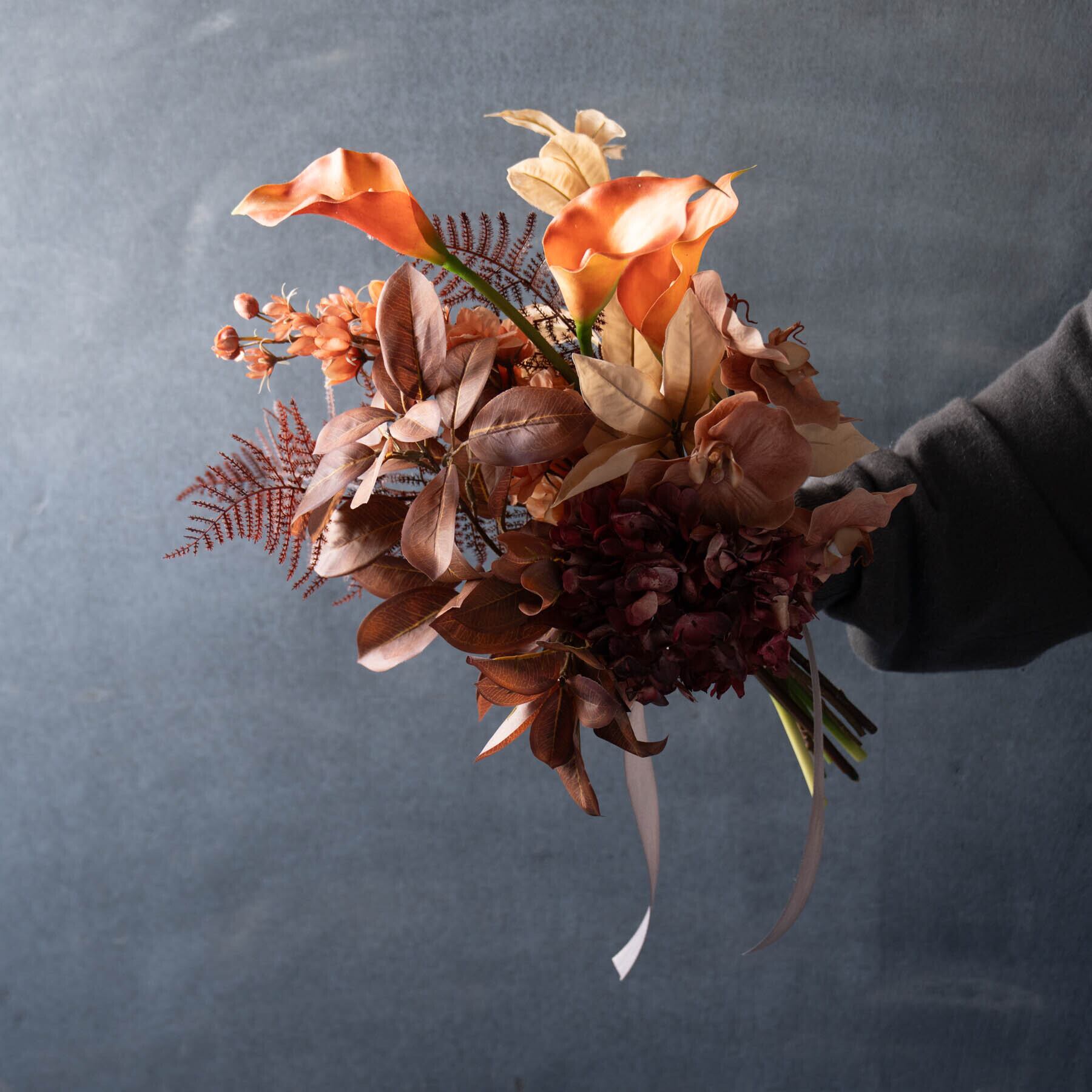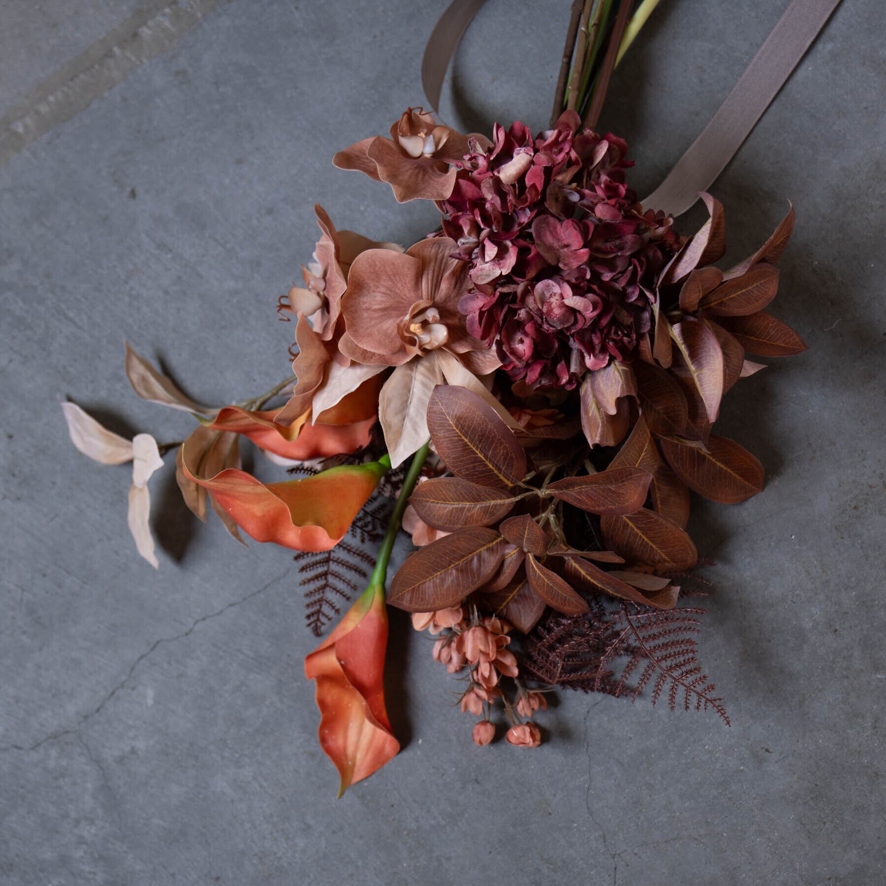 深みのあるオレンジのカラーに、ボルドーの紫陽花やダークブラウンのリーフを束ねた、シックで洗練されたアーティフィシャルフラワーブーケです。