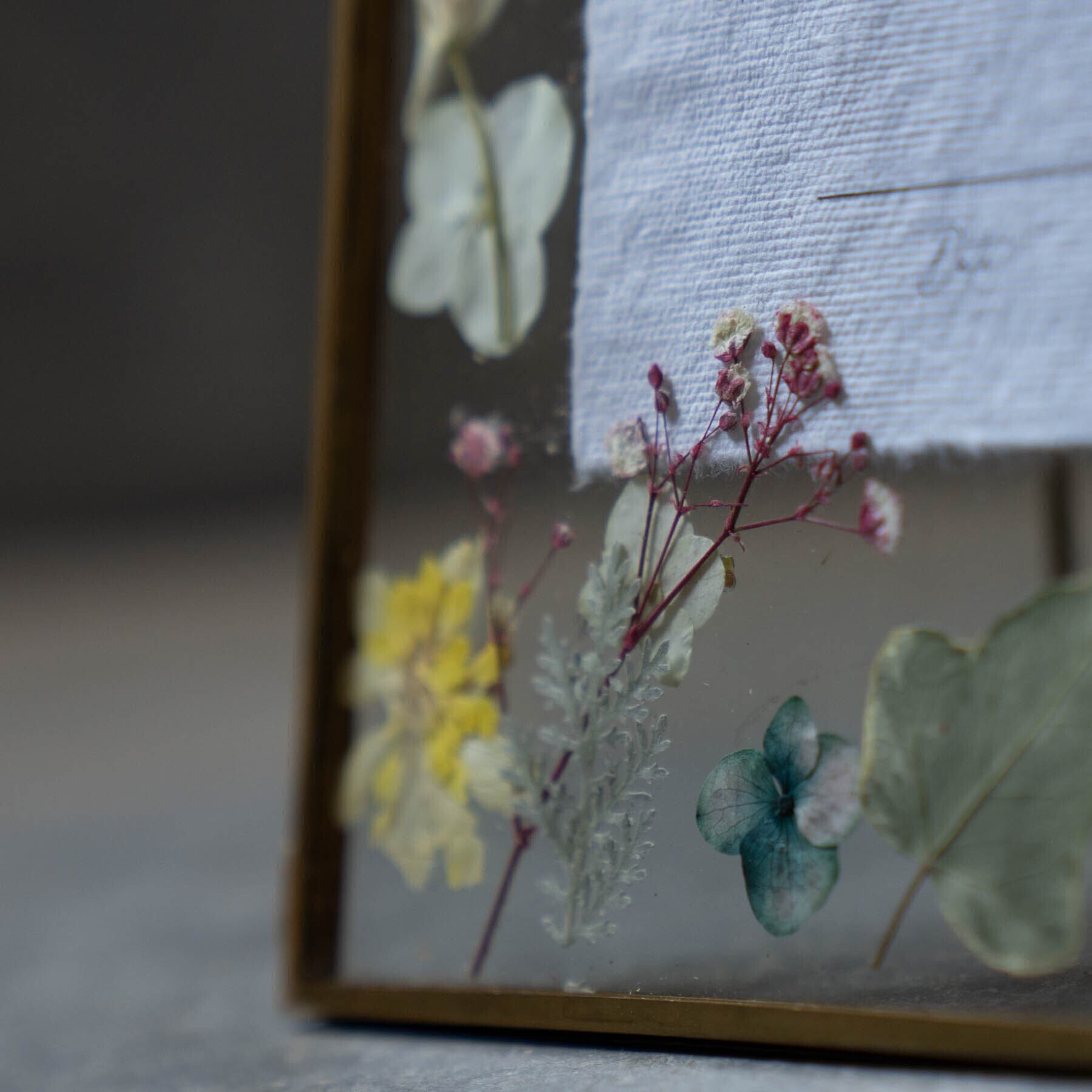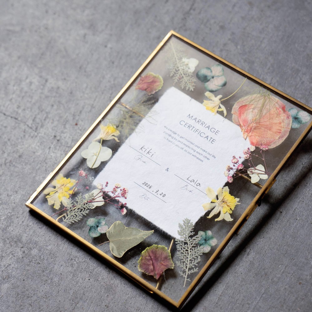 本物の草花を一つひとつ丁寧に押し、ガラスフレームの中に閉じ込めた結婚証明書です。