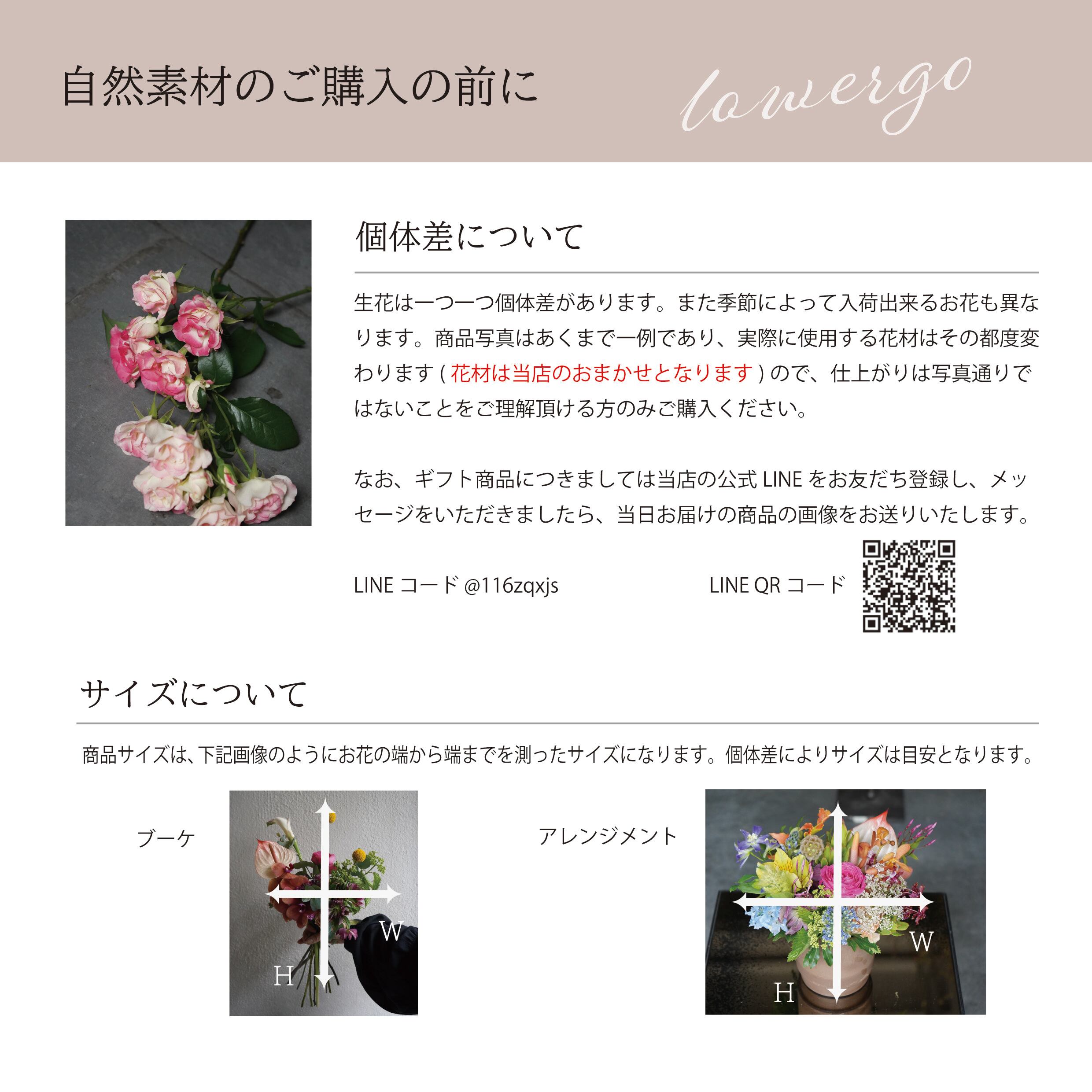 生花は一つ一つ個体差があり、季節によって入荷出来るお花も異なります。掲載している写真はあくまで一例であり、実際に使用する花材はその都度変わりますので、仕上がりは写真通りではないことをご理解頂ける方のみご購入ください。(花材は当店のおまかせとなります。)