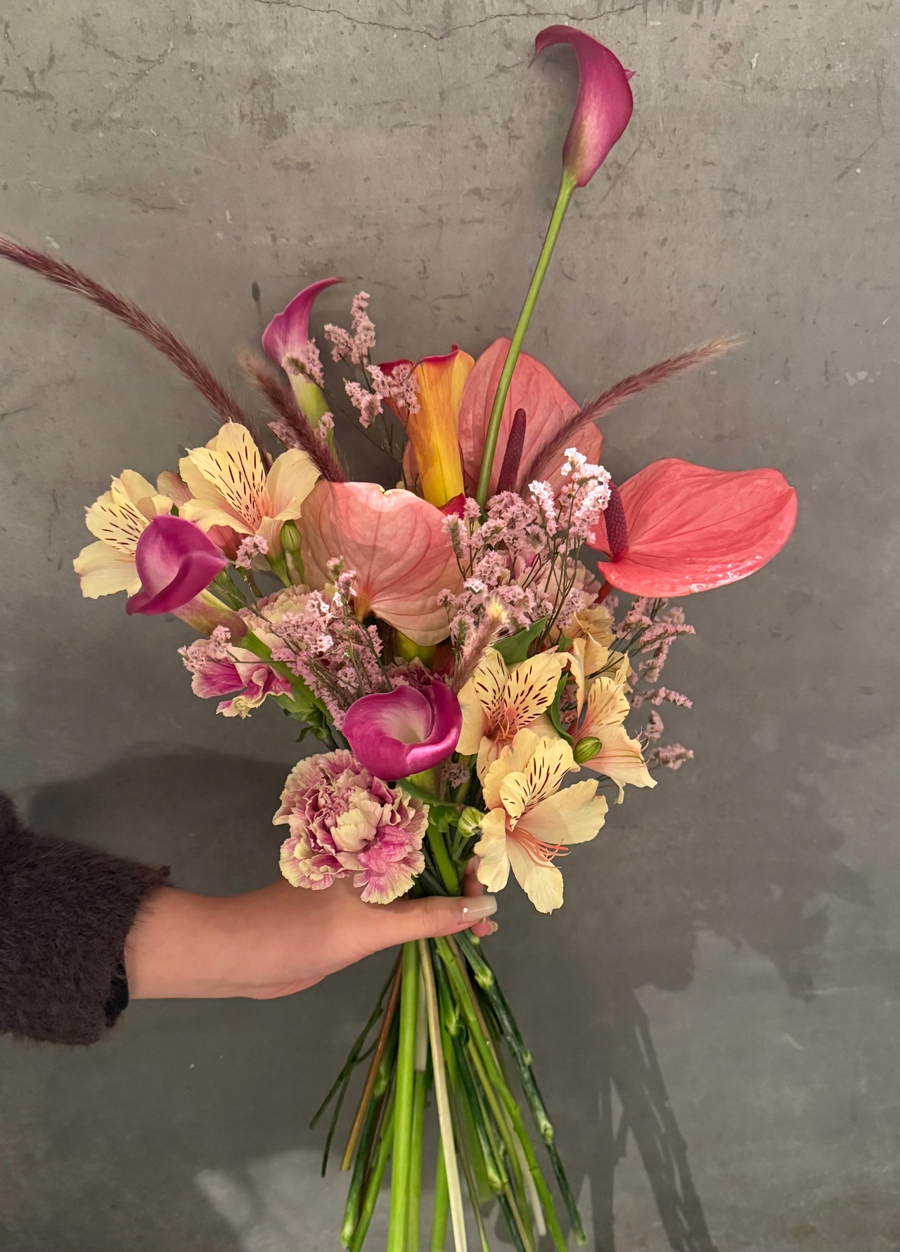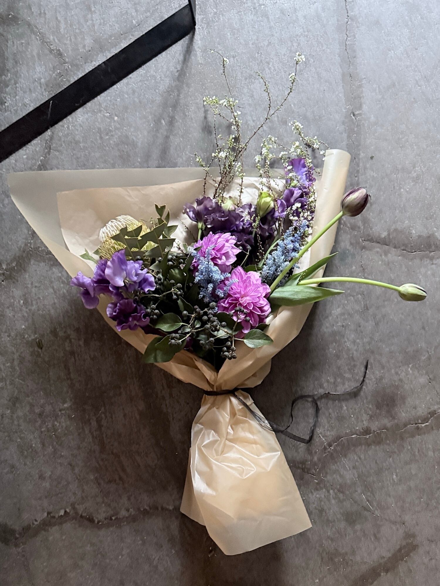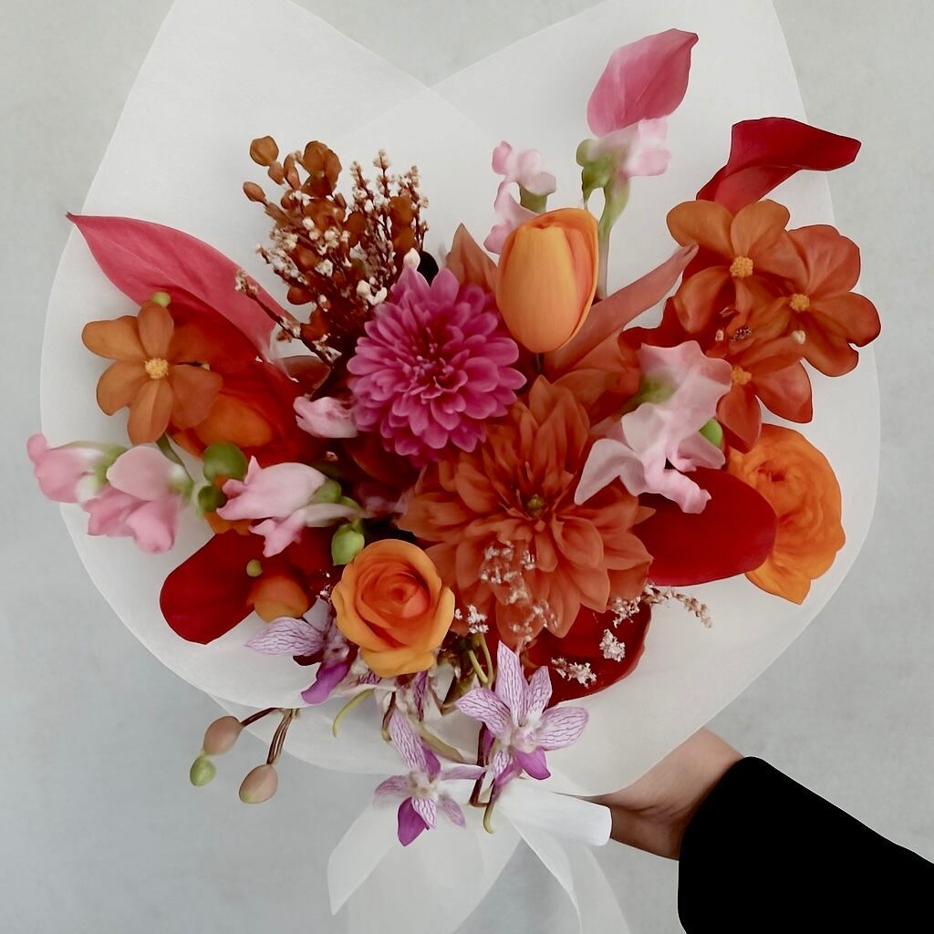フレッシュで色鮮やかな花々やグリーンを束ねた不動の人気の当店おまかせブーケ。