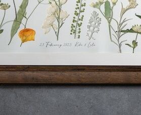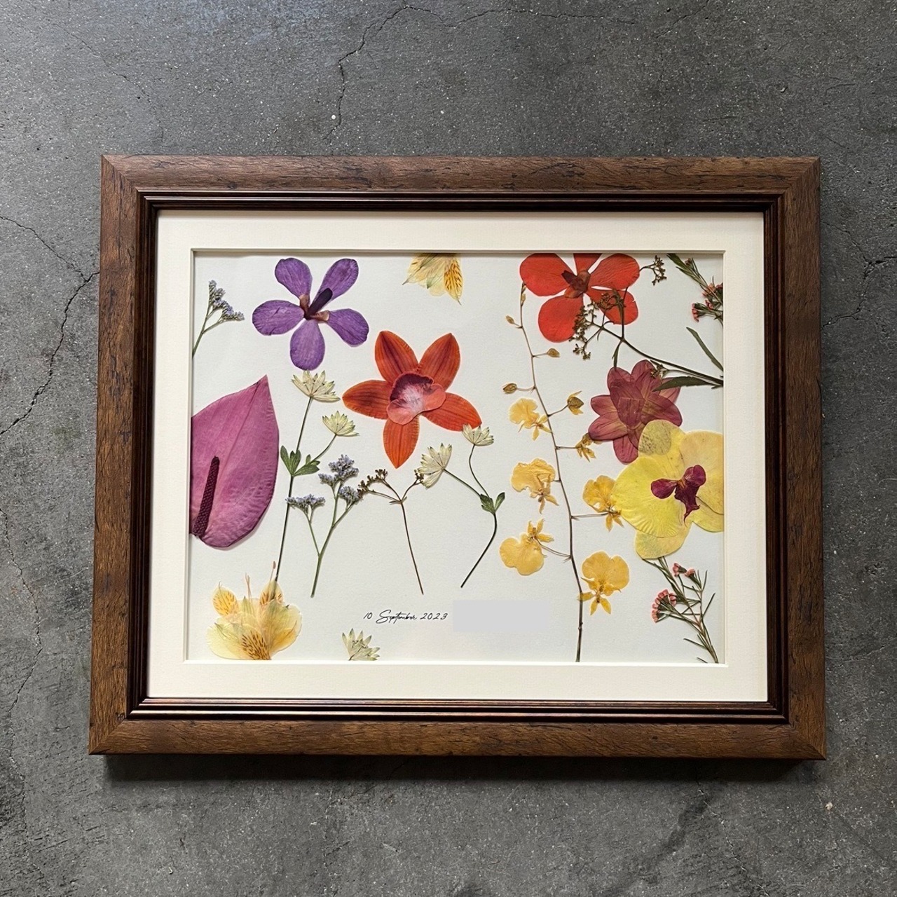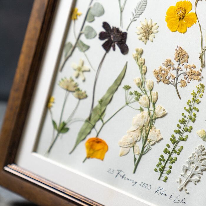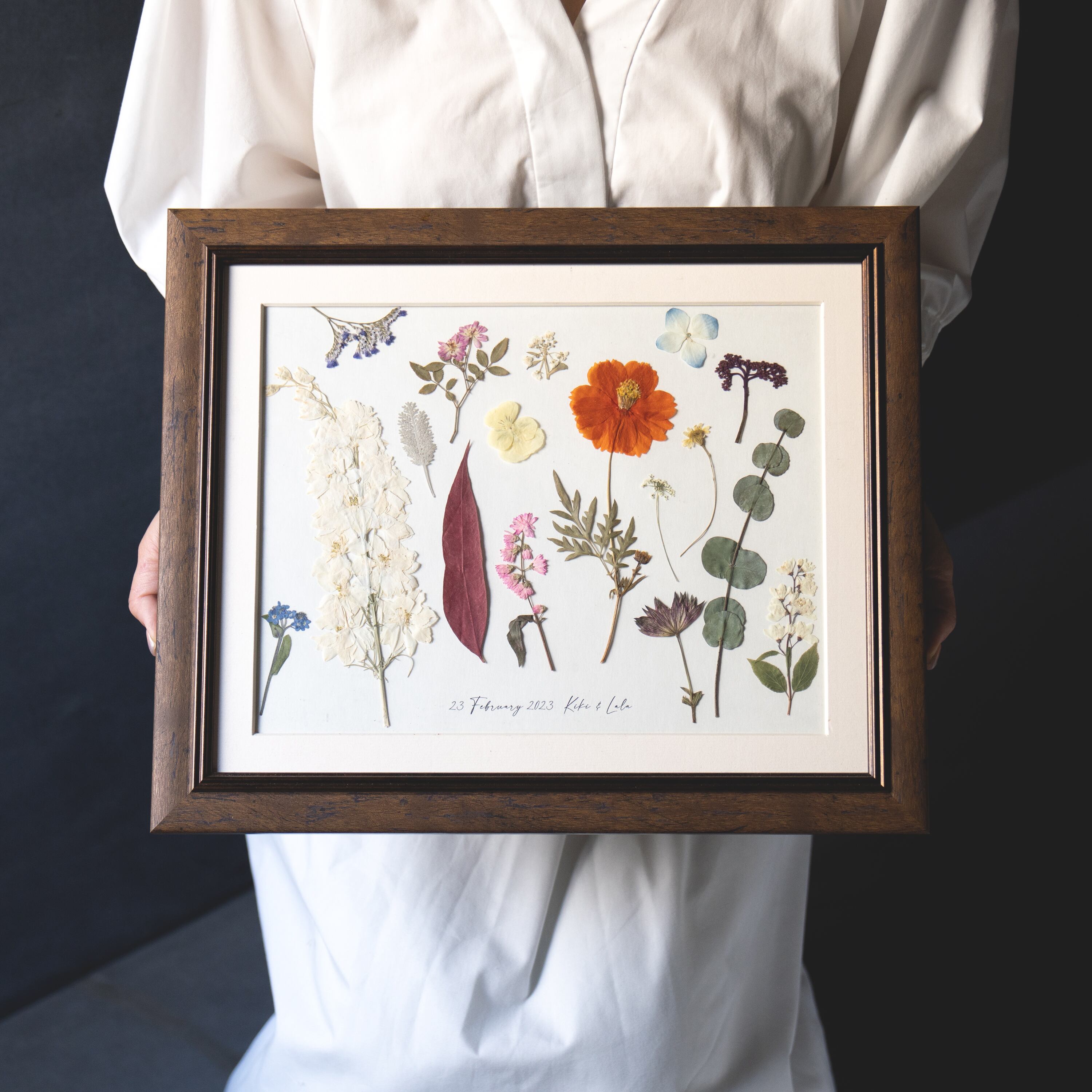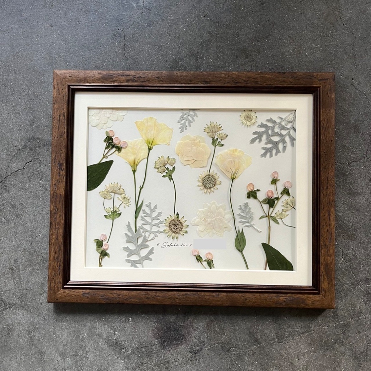 結婚式、前撮り、フォトウェディング、プロポーズ等で使用した後の生花ブーケをお預かりし、オリジナルプレスをして額装いたします。独自の技術で結婚式当日のような生花の美しさを再現し、インテリアとしても褒められるデザイン性の高さが人気です。