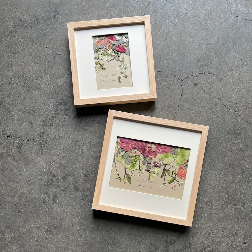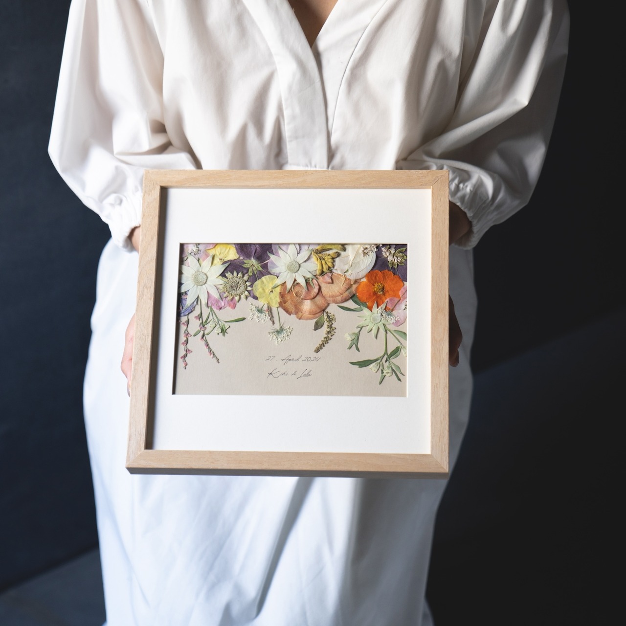 結婚式、前撮り、フォトウェディング、プロポーズ等で使用した後の生花ブーケをお預かりし、オリジナルプレスをして額装いたします。独自の技術で結婚式当日のような生花の美しさを再現し、インテリアとしても褒められるデザイン性の高さが人気です。