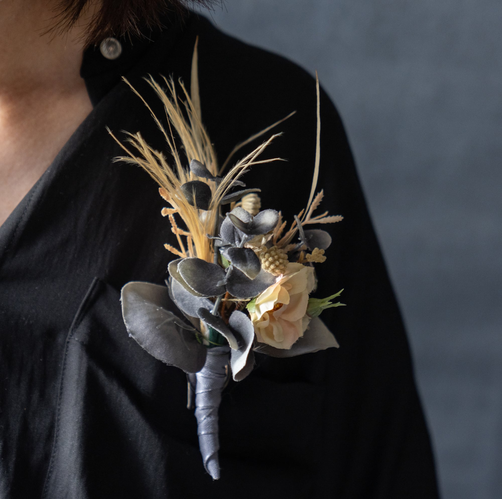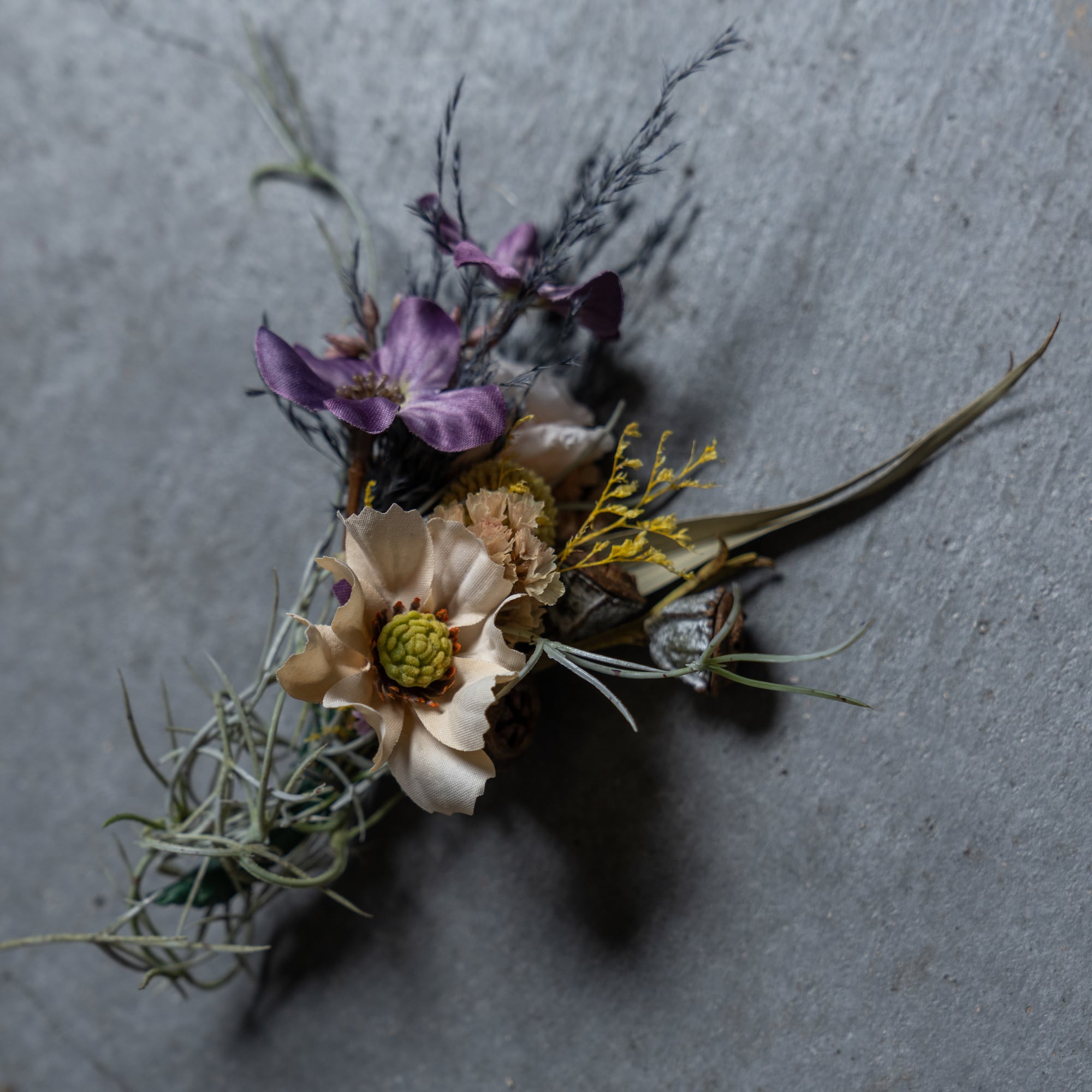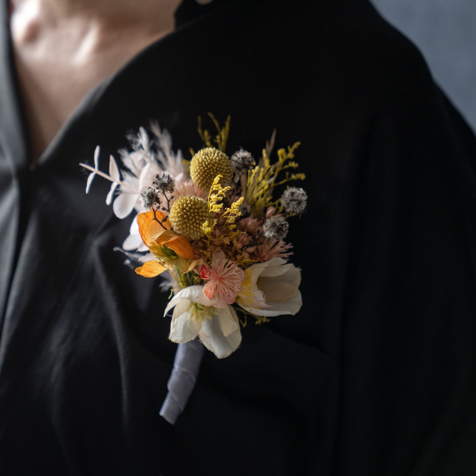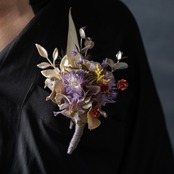 ドライフラワーとアーティフィシャルフラワー(造花)をmixしたコサージュです。
