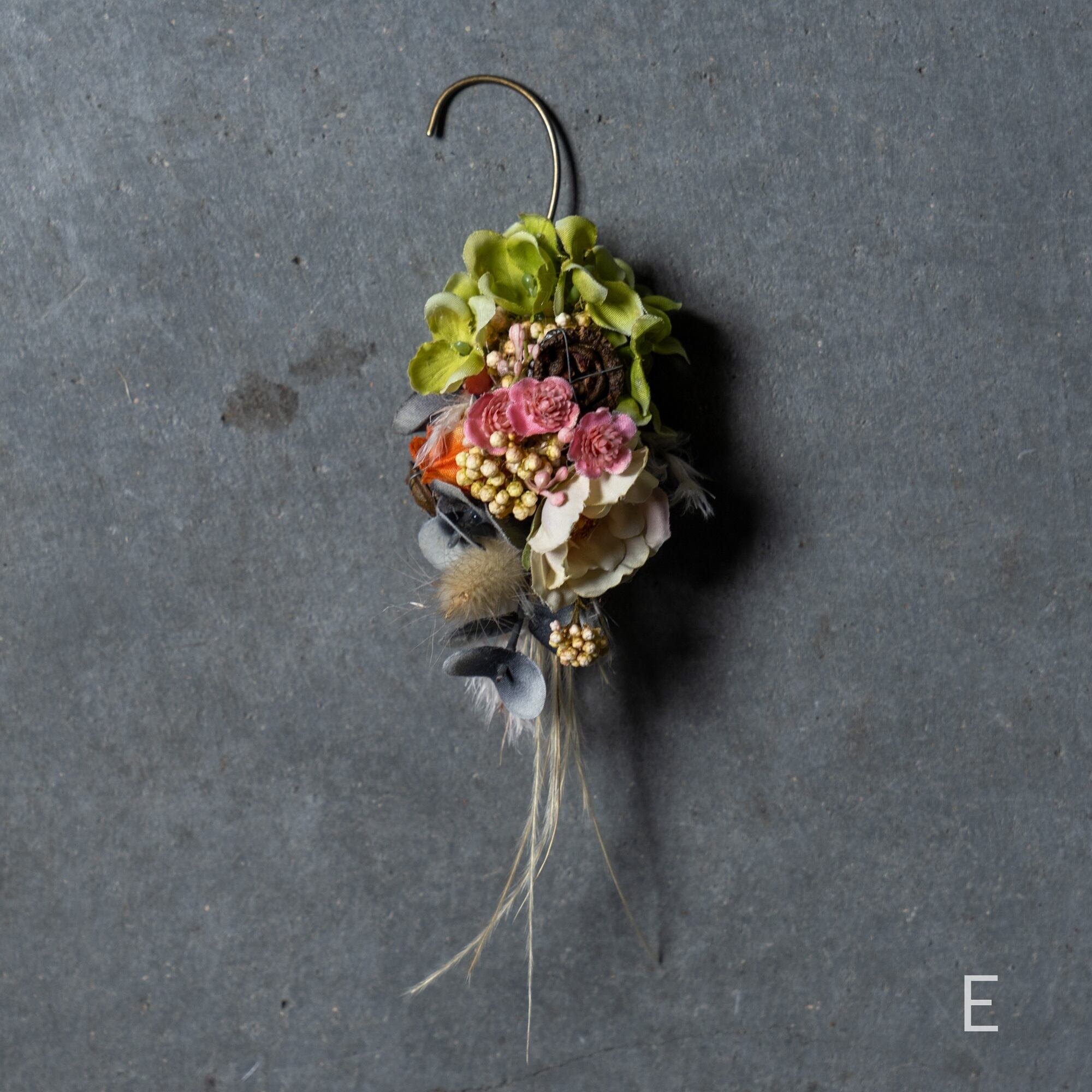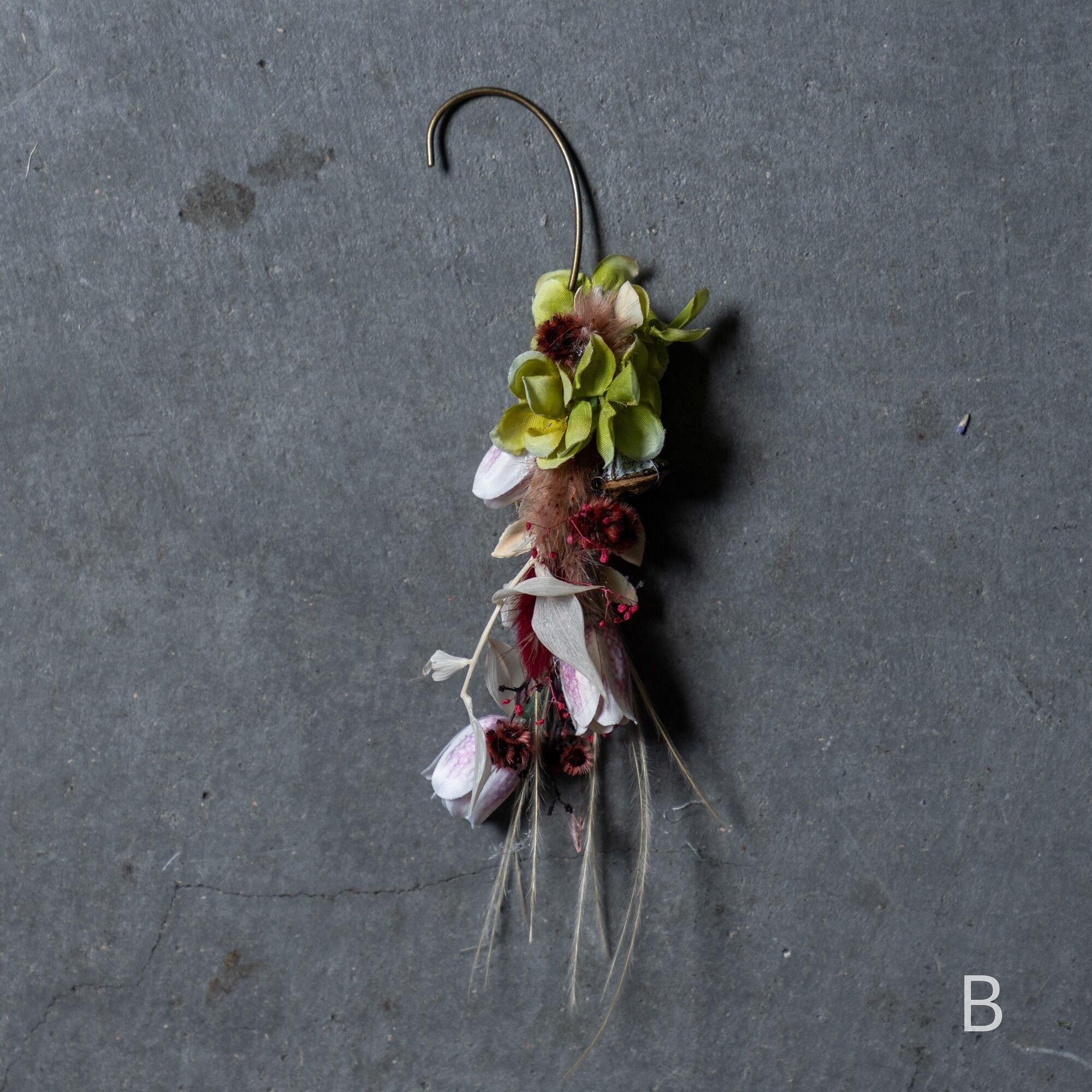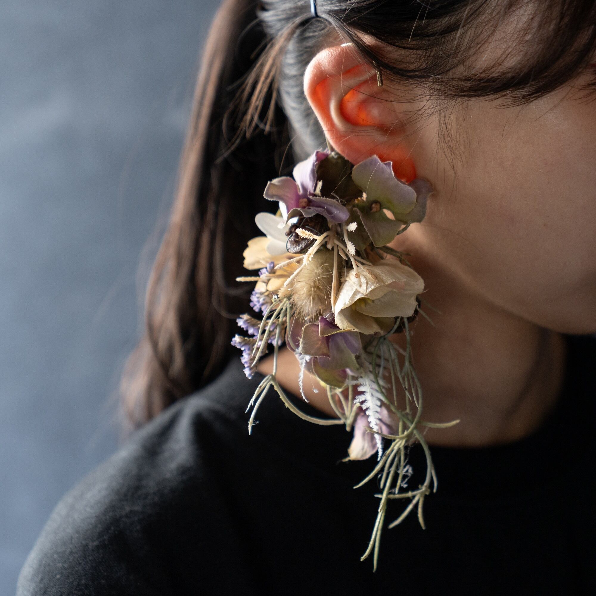 耳に沿ったフックから流れるように垂れ下がった存在感抜群のお花が、お顔まわりを華やかに彩ります。