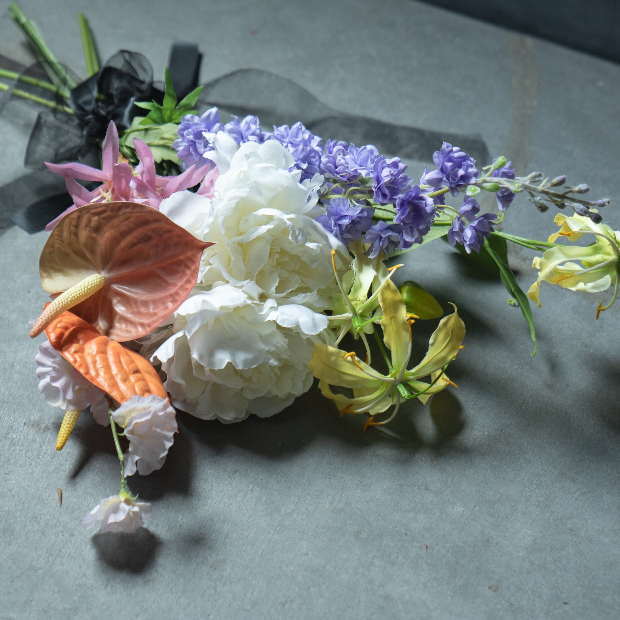 アンスリウム、グロリオサ、デルフィニウム、ピオニー‥など人気の花材を沢山使用しました♪
