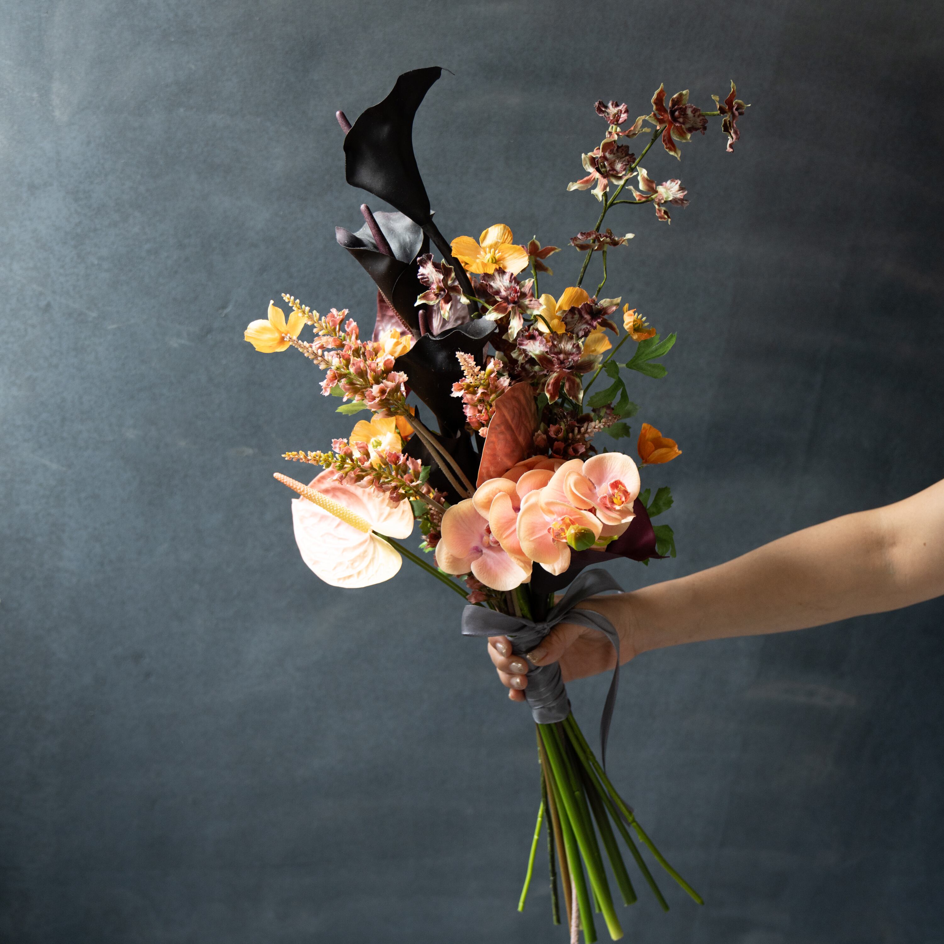 今流行りのブラックとテラコッタカラーでまとめているので、ブラックウェディングのコーディネートに大変おすすめのブーケに仕上がっています。